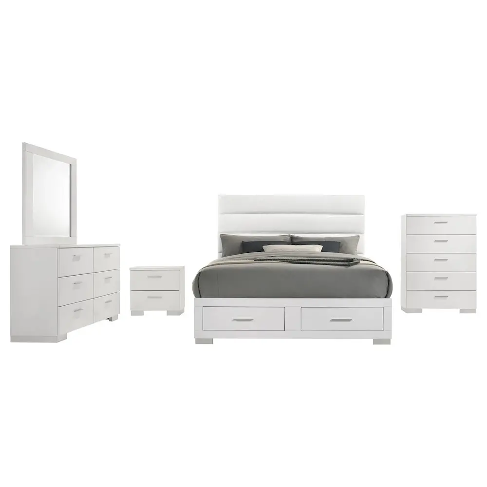 – Contemporary bedroom set featuring clean lines and minimalist appeal – Upholstered bed in white faux leather with horizontal channel tufting – Case pieces finished in high-gloss white polyurethane for a polished look – Spacious drawers with felt-lined top compartments for secure storage – Polished chrome handles and full-extension metal glides for smooth operation – Durable construction ensures lasting quality and elegance