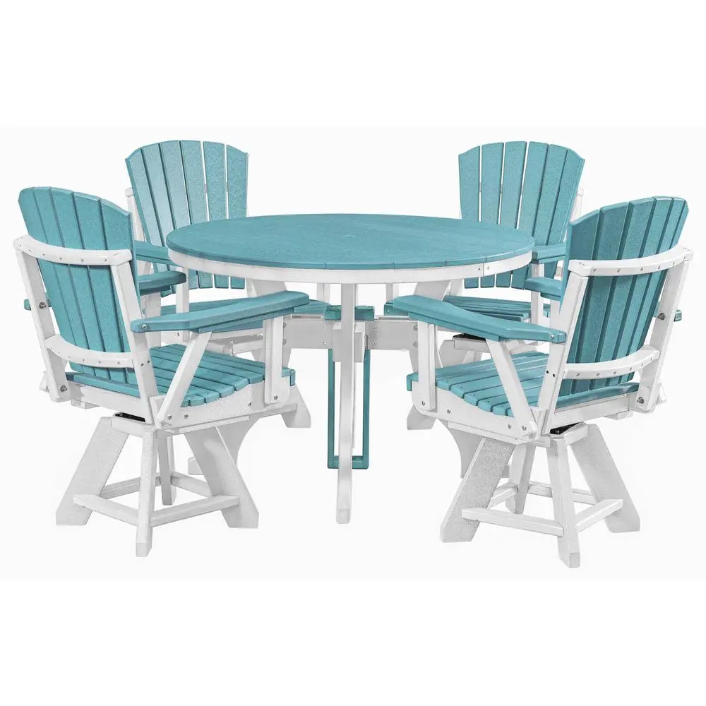 Enjoy our patio and outdoor furniture assortment for years and years. This heavy duty round dining height table and dining height fan back swivel arm chairs feature our Aruba Blue colored seat and back on a White base. Every item is made of high-density recycled poly resin infused with UV stabilized colored plastic. This material is UV fading resistant, water resistant, extremely durable and built to last. All hardware is made of stainless steel and our swivel mechanism is made in the USA. Proudly made by the Amish community in Indiana, United States.