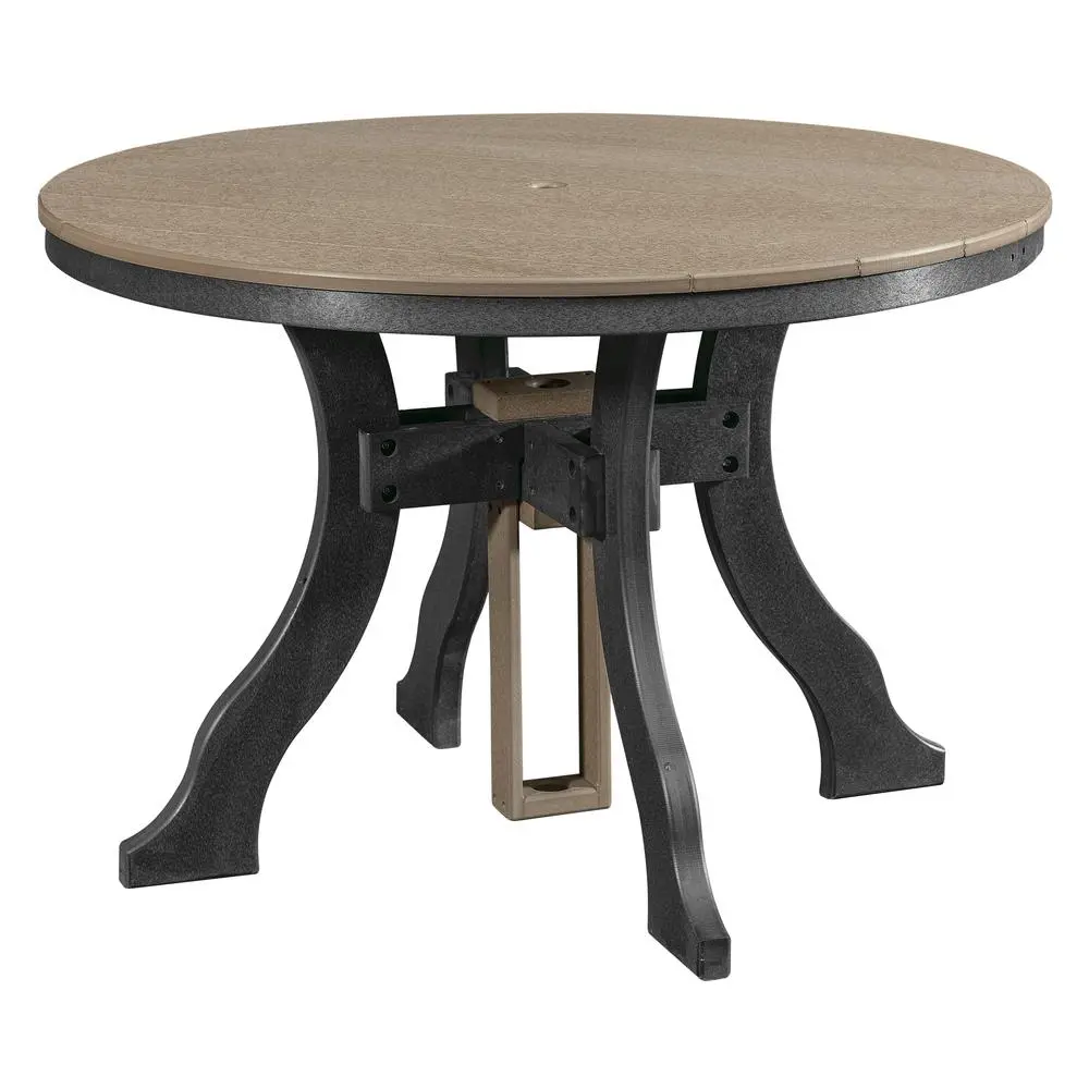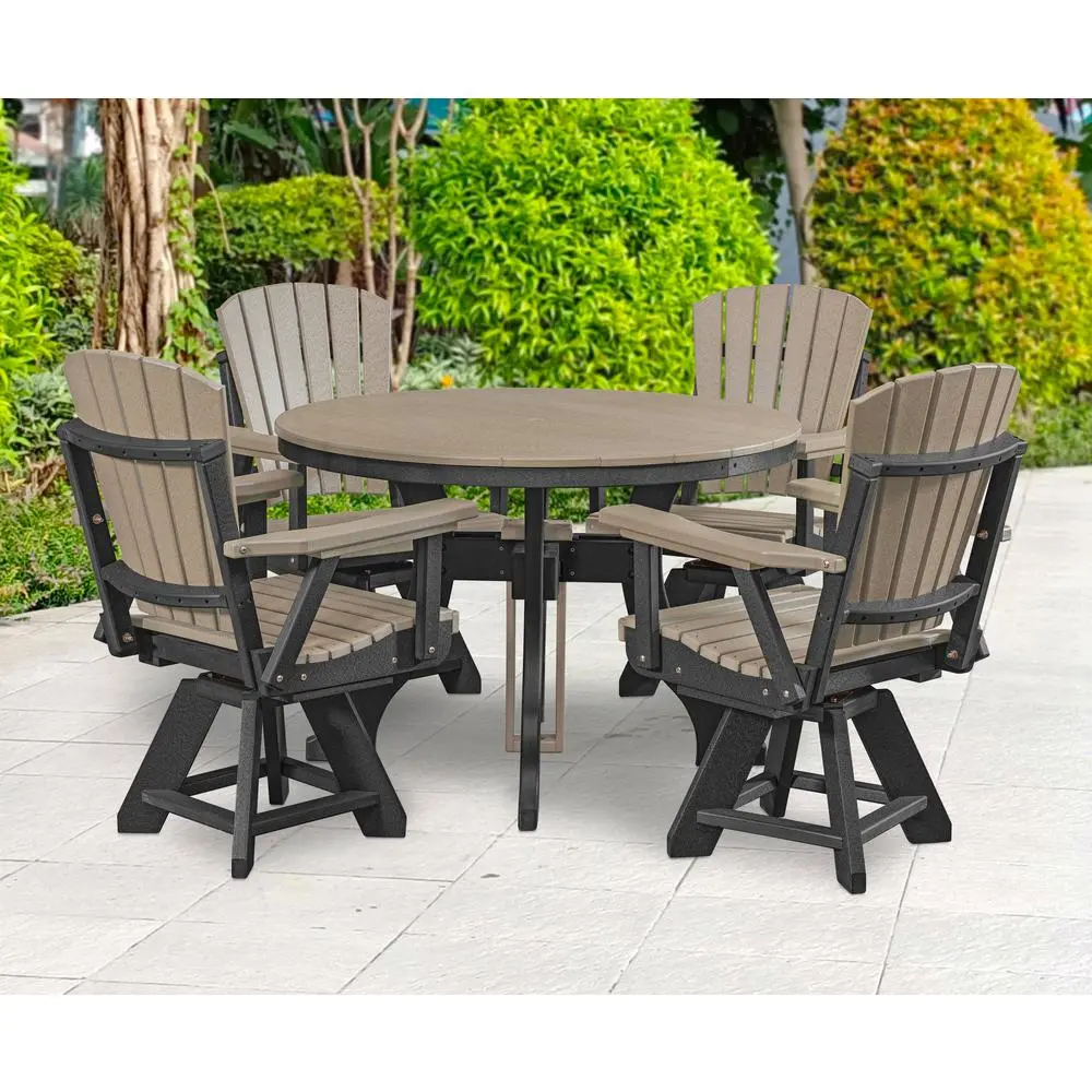 Enjoy our patio and outdoor furniture assortment for years and years. This heavy duty round dining height table and dining height fan back swivel arm chairs feature our Weatherwood colored seat and back on a black base. Every item is made of high-density recycled poly resin infused with UV stabilized colored plastic. This material is UV fading resistant, water resistant, extremely durable and built to last. All hardware is made of stainless steel and our swivel mechanism is made in the USA. Proudly made by the Amish community in Indiana, United States.