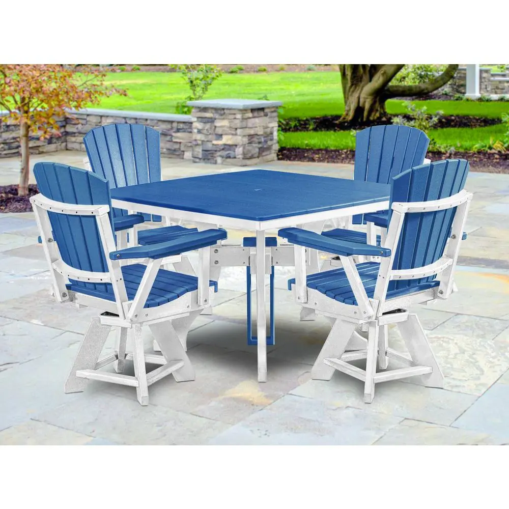 Enjoy our patio and outdoor furniture assortment for years and years. This heavy duty square dining height table and dining height fan back swivel arm chairs feature our Blue colored seat and back on a White base. Every item is made of high-density recycled poly resin infused with UV stabilized colored plastic. This material is UV fading resistant, water resistant, extremely durable and built to last. All hardware is made of stainless steel and our swivel mechanism is made in the USA. Proudly made by the Amish community in Indiana, United States.