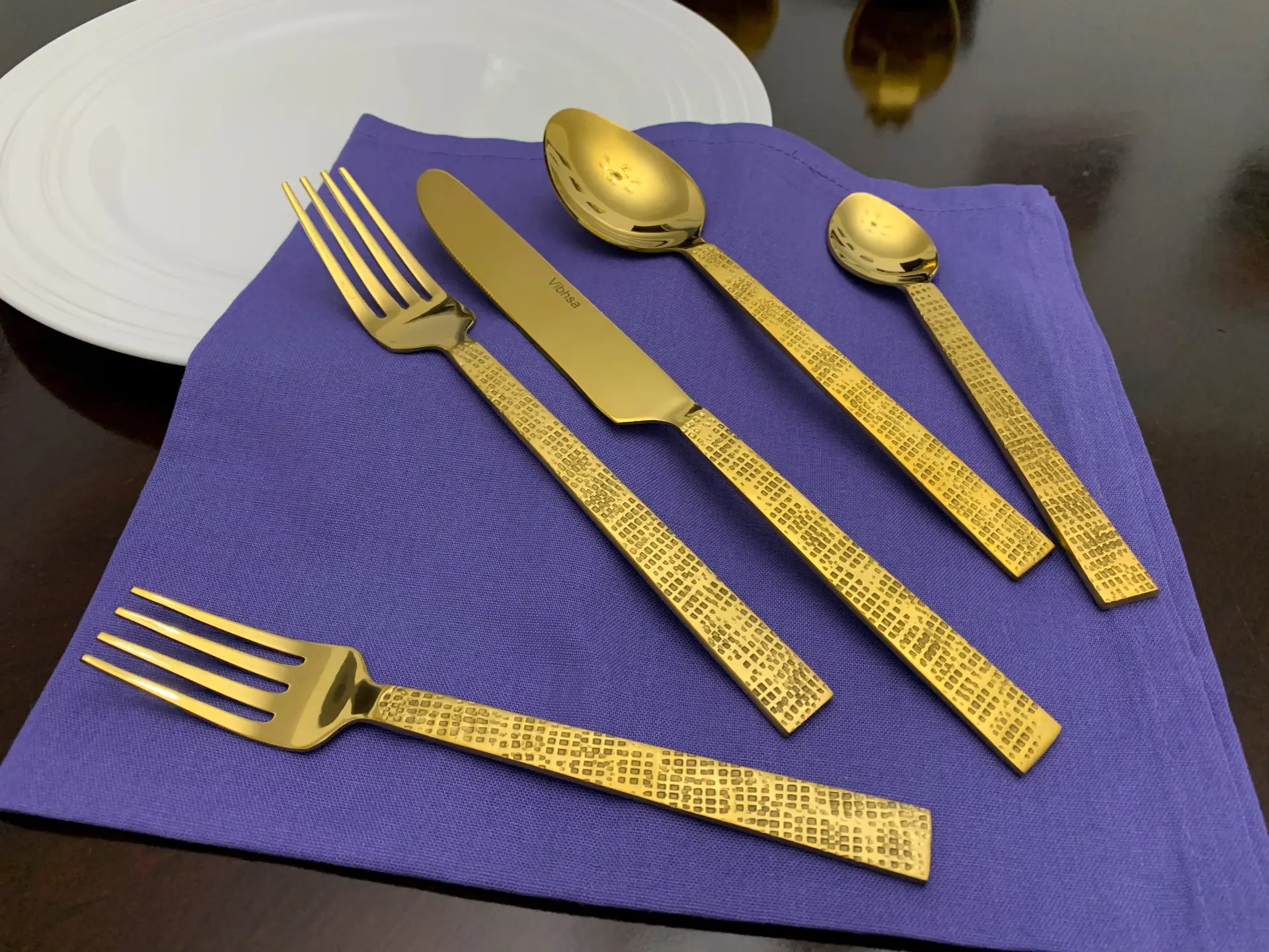 Set your table apart with the Vibhsa Flatware set of 20! This Golden set features 8 Dinner Fork, 9.1″ Dinner Knife, 8″ tablespoon, 6.8″ Teaspoon and 7.2″ salad fork, making it the perfect addition to any table. Each piece is handmade by artisans using traditional sand-casting methods with a beautiful rustic antique Golden finish, and is 100% stainless steeldishwasher safe, though handwashing is preferred. Gift box included! Transform your home with a set that truly stands out!