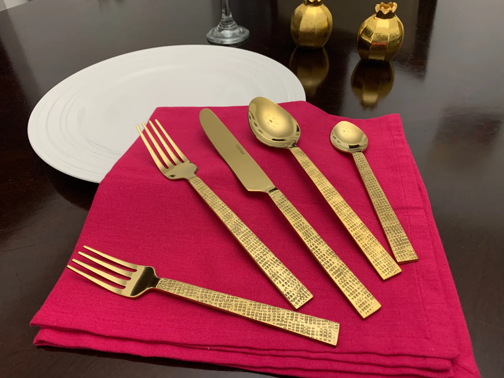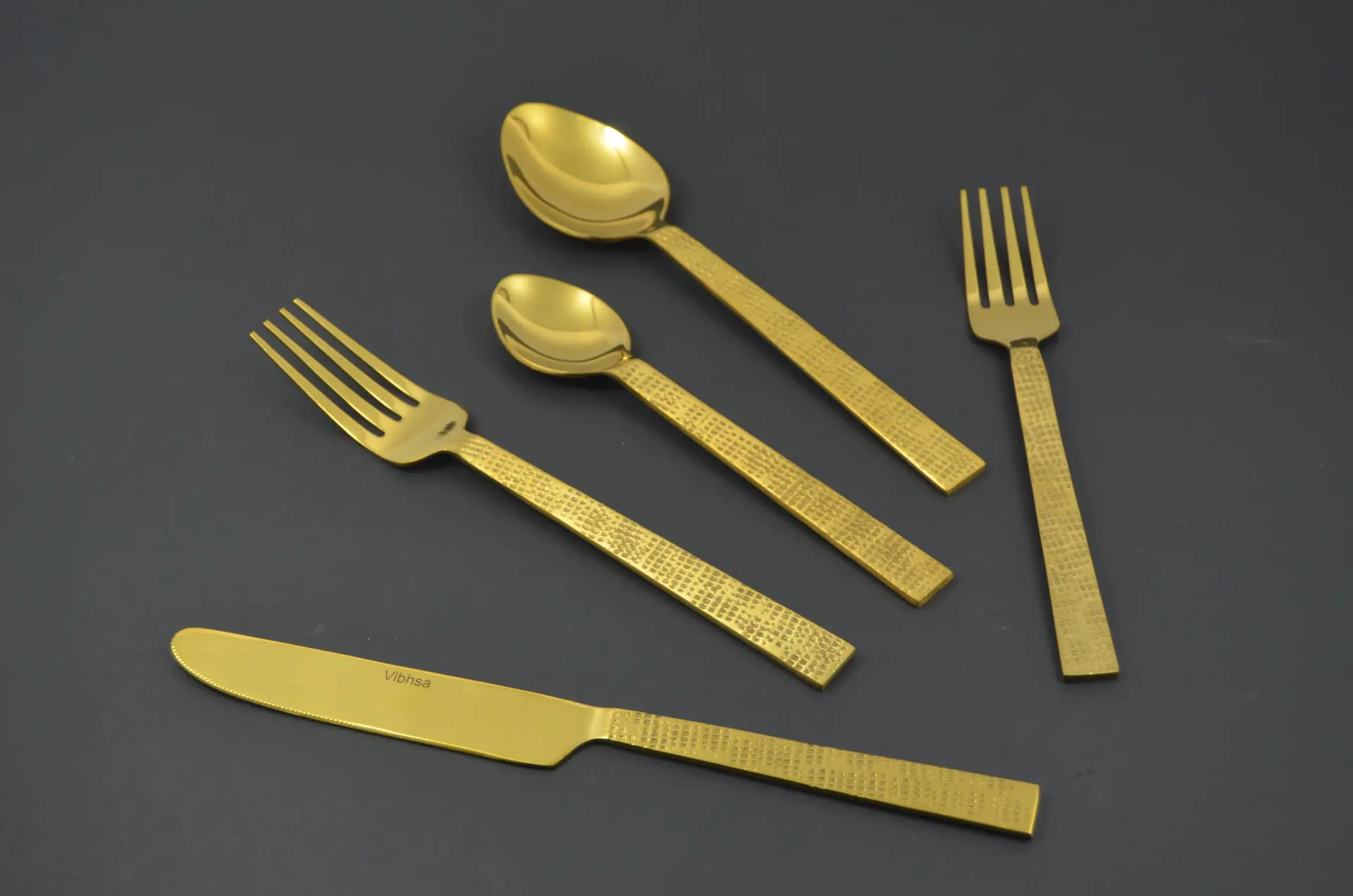 Set your table apart with the Vibhsa Flatware set of 20! This Golden set features 8 Dinner Fork, 9.1″ Dinner Knife, 8″ tablespoon, 6.8″ Teaspoon and 7.2″ salad fork, making it the perfect addition to any table. Each piece is handmade by artisans using traditional sand-casting methods with a beautiful rustic antique Golden finish, and is 100% stainless steeldishwasher safe, though handwashing is preferred. Gift box included! Transform your home with a set that truly stands out!