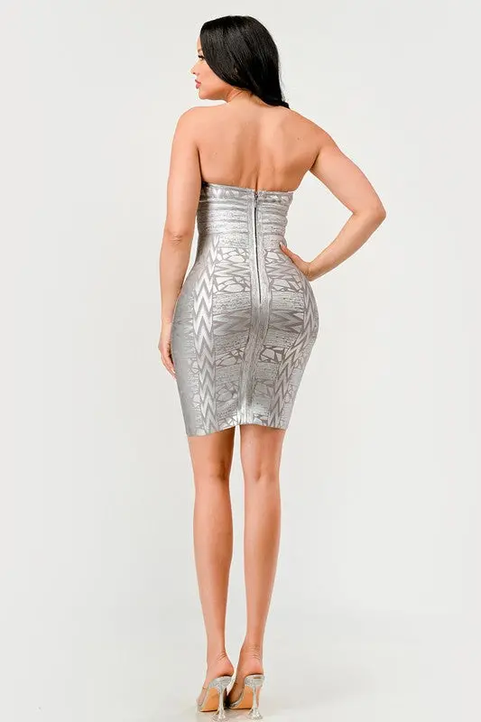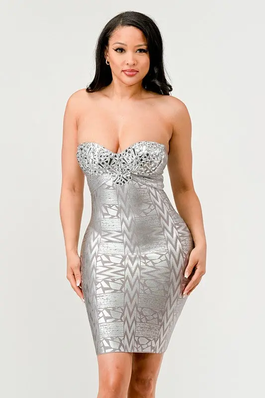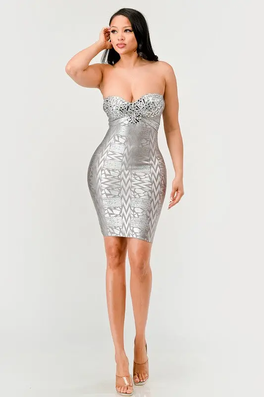 Introducing the “Gilded Glamour Strapless Dress,” a stunning display of elegance and contemporary design. The strapless sweetheart neckline gracefully accentuates the shoulders, offering a tasteful hint of allure. Adorned with radiant silver embellishments, the bodice shines with an array of carefully placed beads and sequins that mimic the intricate patterns of baroque artistry, yet with a distinctly modern flair. The fabric, in a muted champagne shade, glimmers subtly, complementing the body’s natural curves with its form-fitting silhouette.