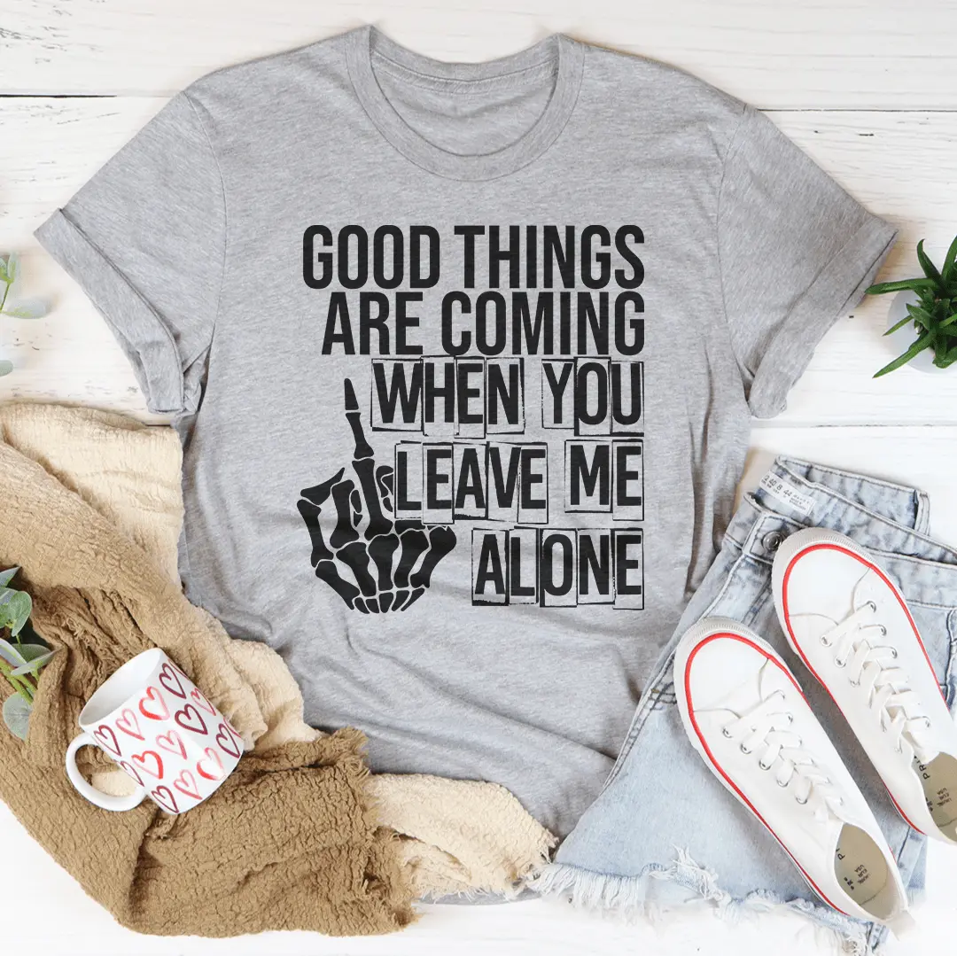 “Immerse yourself in the magic of this USA-made digitally printed tee, designed to captivate. Made with 100% soft and breathable cotton for a comfortable and one-of-a-kind look. Embrace the adorability of this Good Things Are Coming When You Leave Me Alone T-Shirt.”