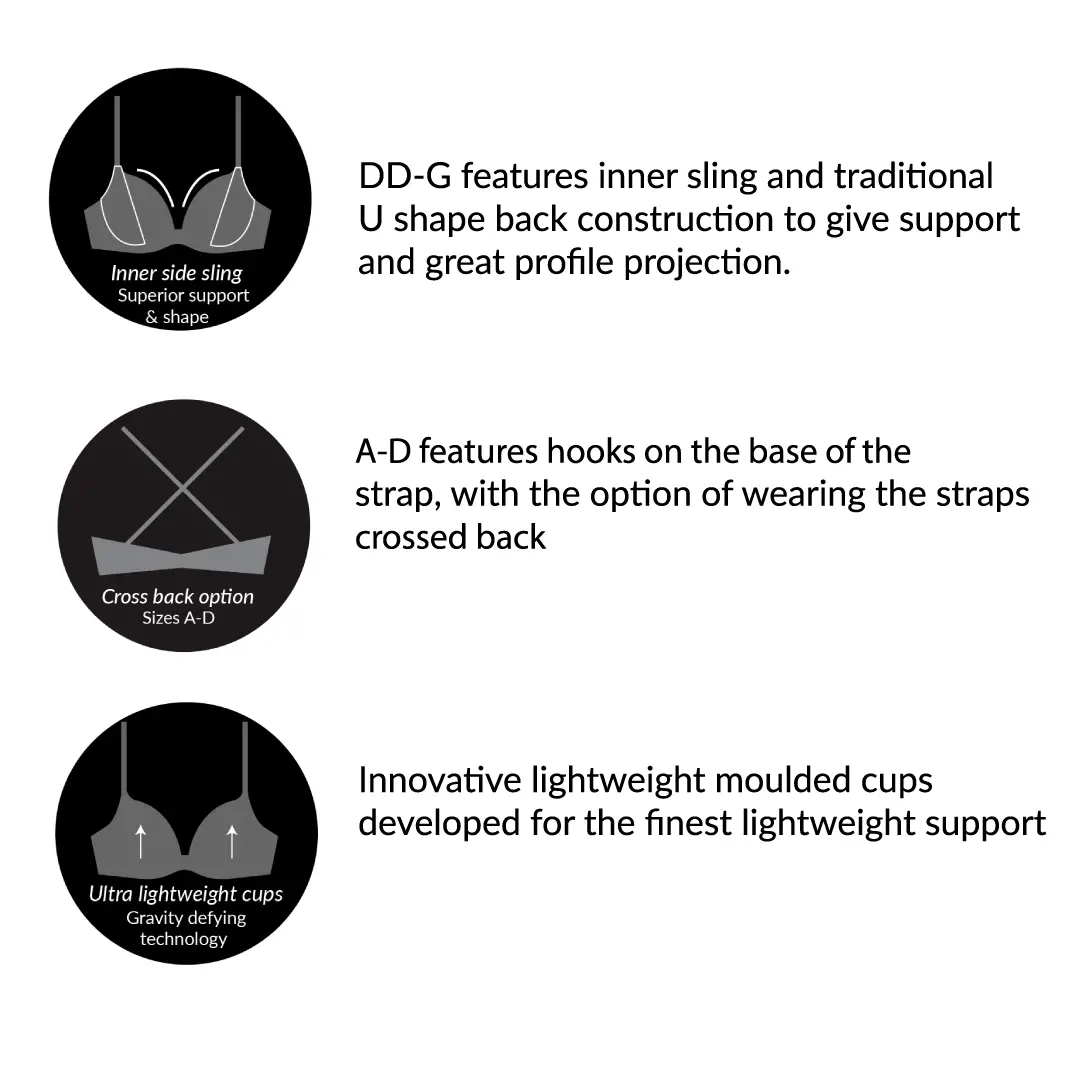 - Molded soft sheer mesh limits stretch and provide support for A toH cups.