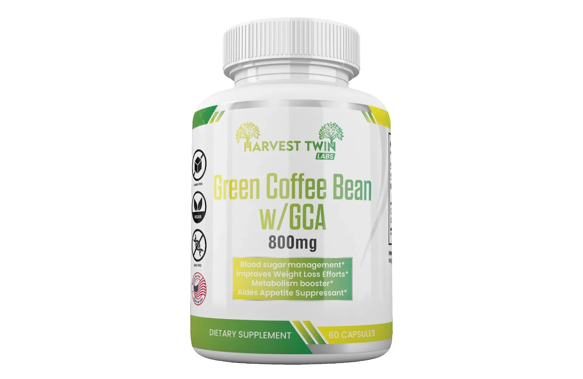 Harvest Twin Labs Green Coffee Bean with GCA helps manage blood sugar, support weight loss, and promote a healthy metabolism. Each capsule contains 800mg of all-natural GCA for the most effective results.