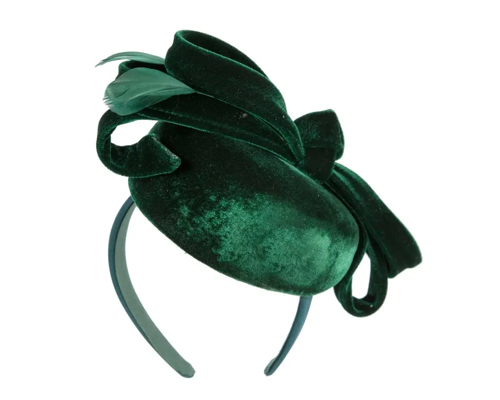 Beautiful green velvet pillbox decorated with hand-made bow and soft feathers. Perfect choice for your next autumn or winter racing outfit.
