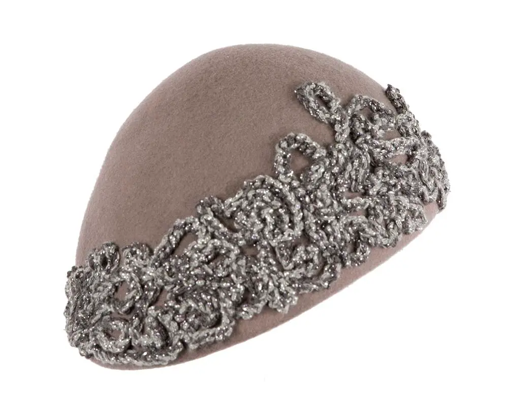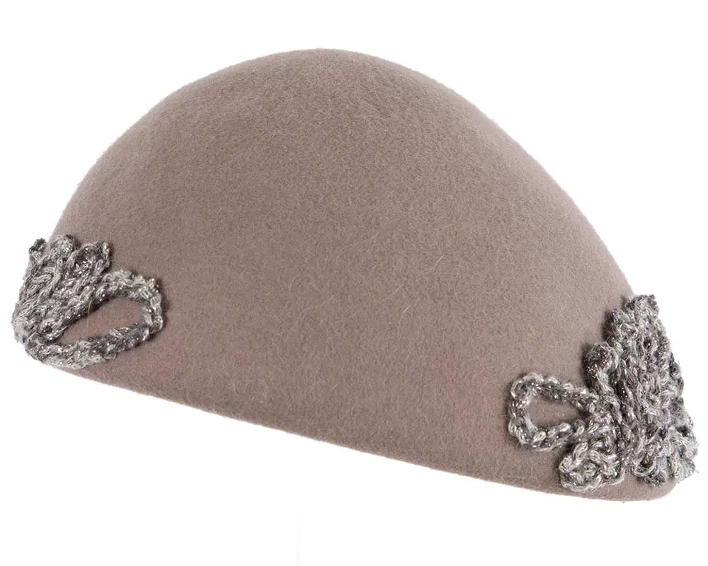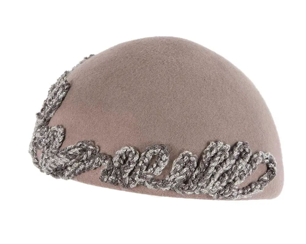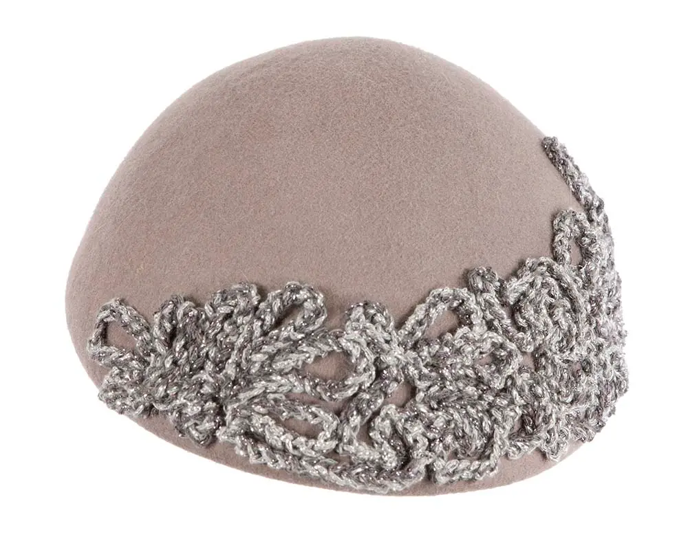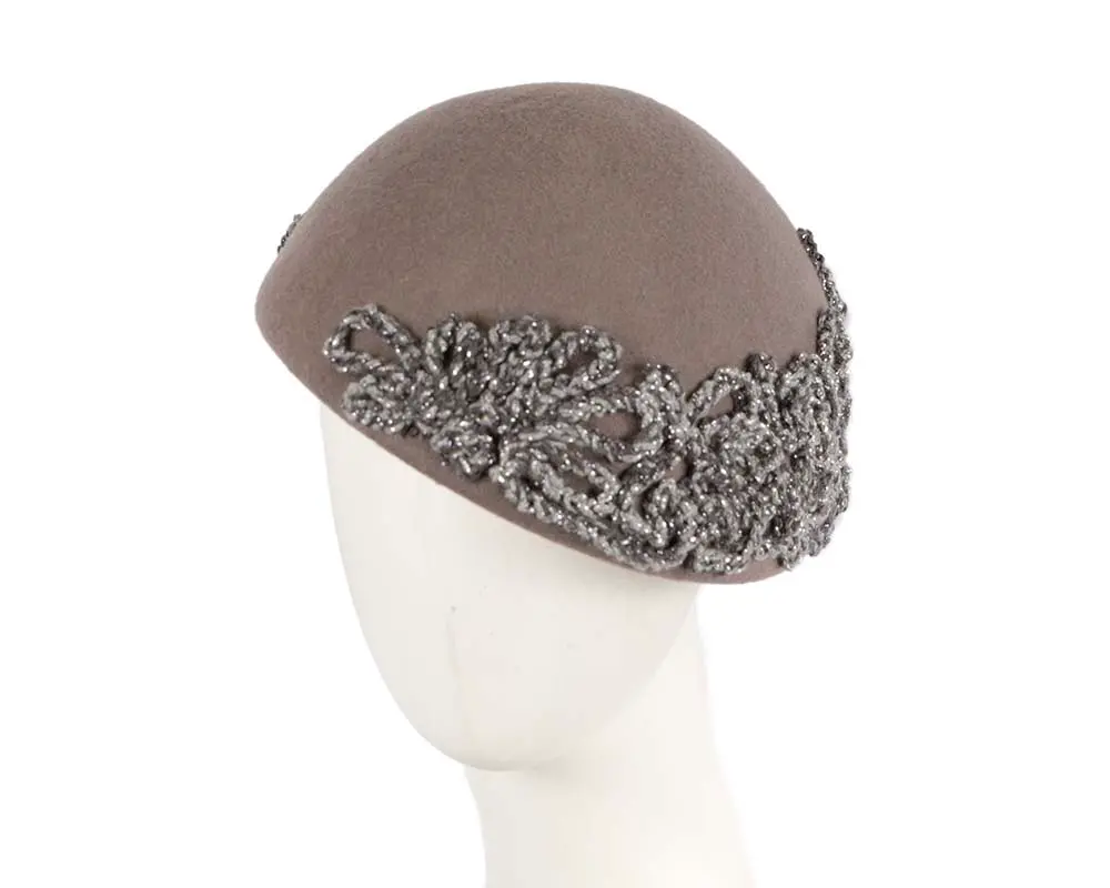 Grey fashion beret made from wool felt with hand-crocheted decoration