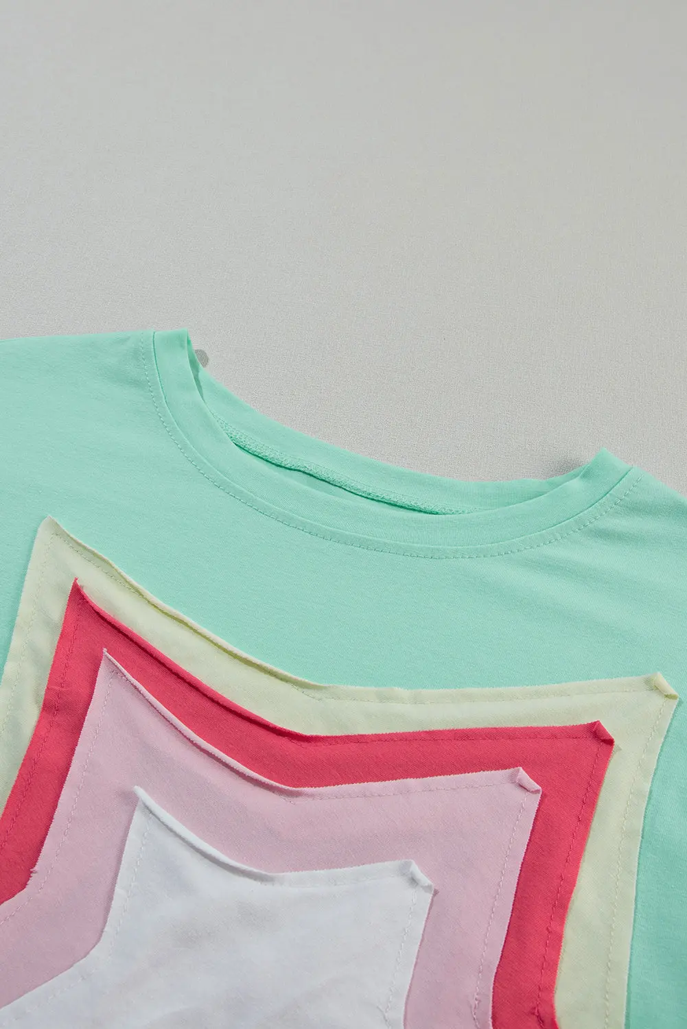 - This quirky tee is great for any season, whether you’re rocking it solo or layering it under jackets! With an oversized fit that’s both stylish and comfy, and a flattering crew neck, this top is sure to suit any body type. The strategically placed star patches add a unique colorblock twist for a fun and laid-back look.