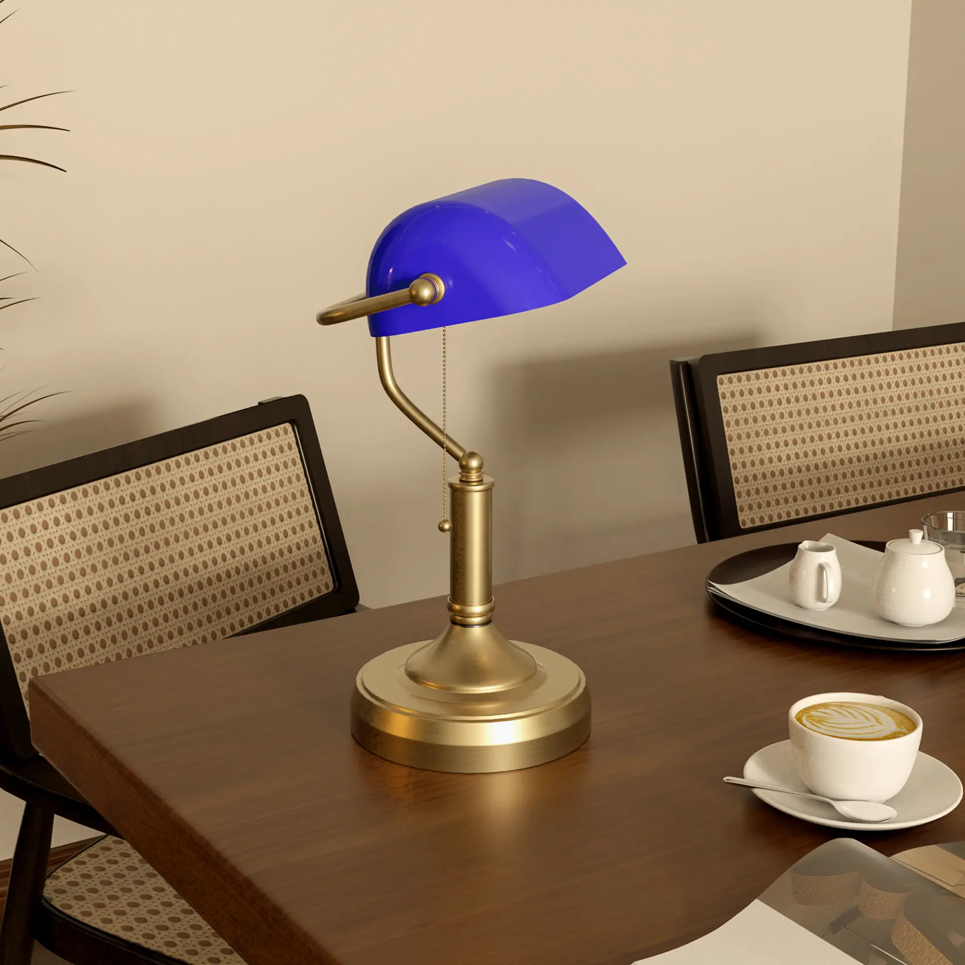 - Classic banker’s style: Desk lamp with traditional style and vintage flair. Features a slender body and flared base with a lovely, polished brass tone finish and a blue glass shade. Suitable for a home office.