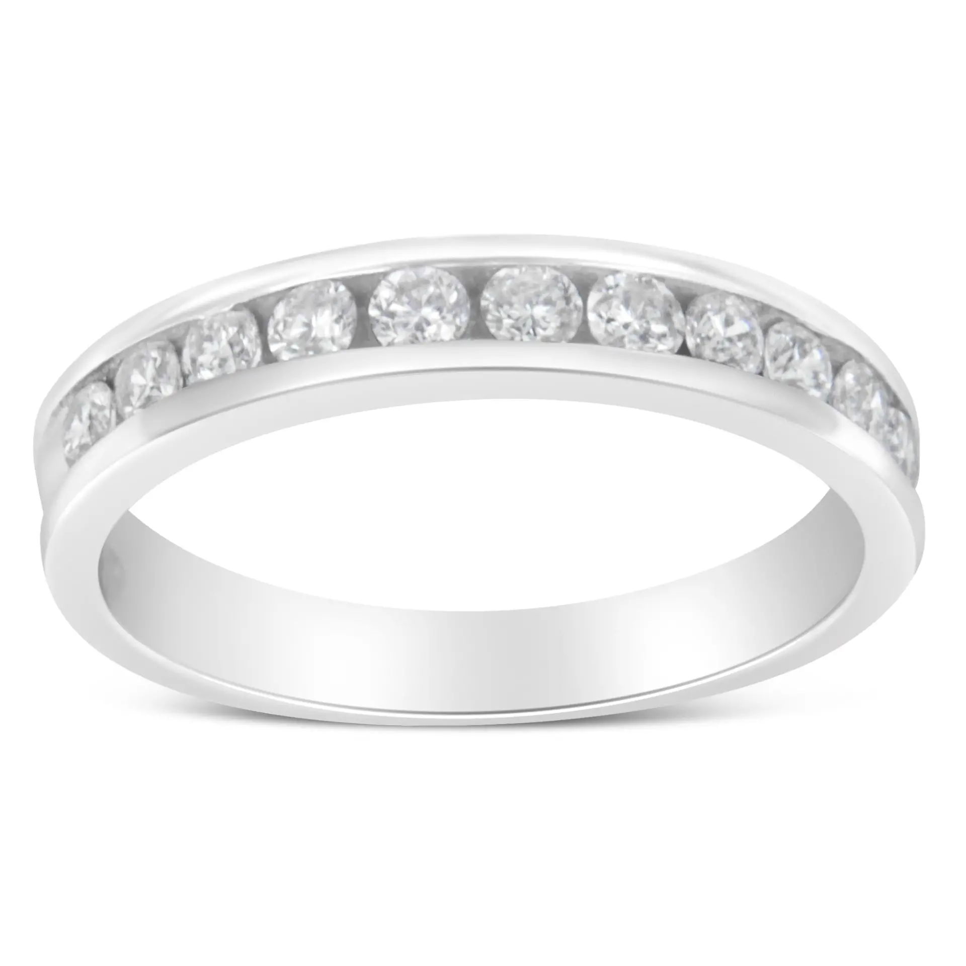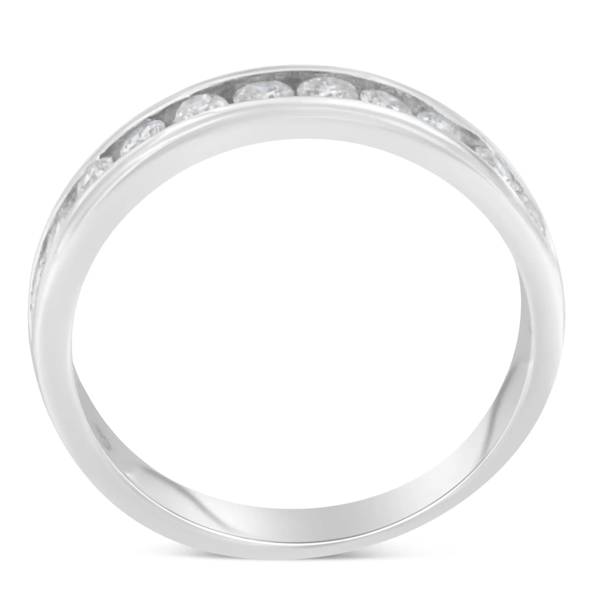 Elegant and timeless, this diamond wedding band features 1/2 carat total weight of diamonds with eleven individual stones. This exquisite IGI certified 18 karat white gold wedding ring has eleven beautiful round, brilliant cut white diamonds channel set side by side into the face of this half-eternity style band. This classic yet bold modern band style ring makes a great gift for any special occasion and can serve as a promise ring, engagement ring, or anniversary band as well. Whether worn for daytime glamour or evening sparkle, this straight band is gorgeously versatile. Its a timeless treasure shell enjoy wearing every day.
