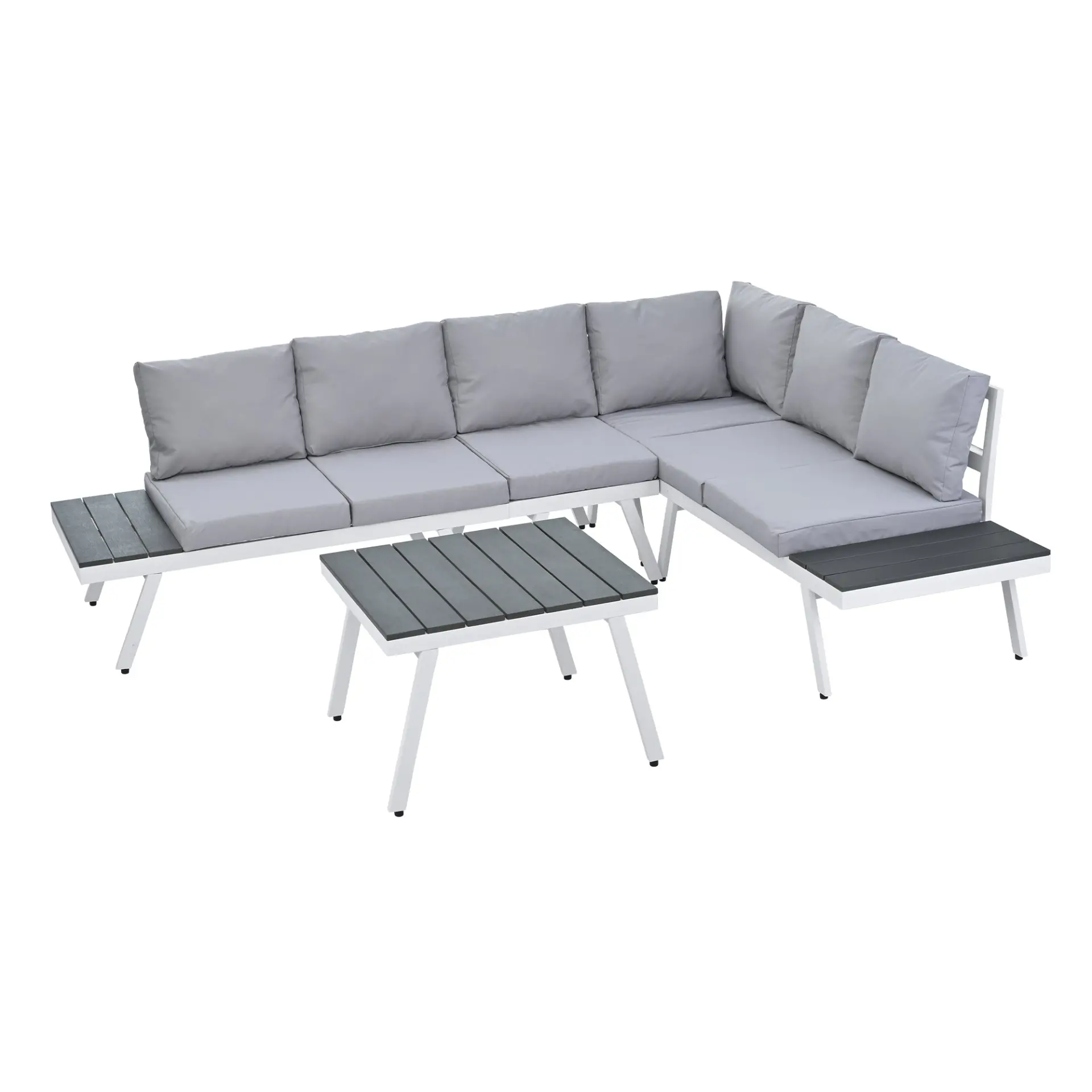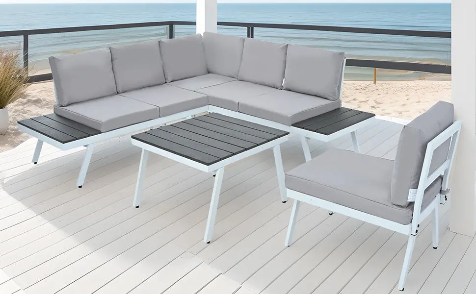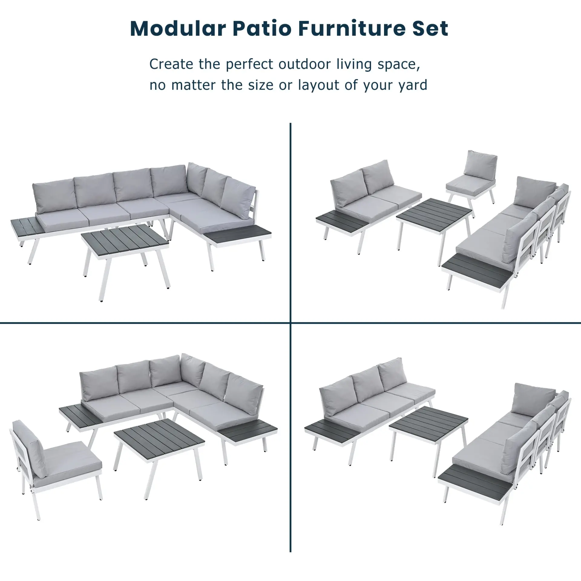 - [Aluminium Patio Sofa Set] Modular instructure sofa ensembles with a sectional configuration comprising of 2 loveseats, 1 armless seat, 1 corner seat, and 1table, tailor-made for luxurious outdoor relaxation.You can create the perfect outdoor living space, no matter the size or layout of your yard.The entire patio sofa set is skillfully structured with lightweight, weather-resistant aluminum frames that ensure longevity and dependable coverage against the elements.