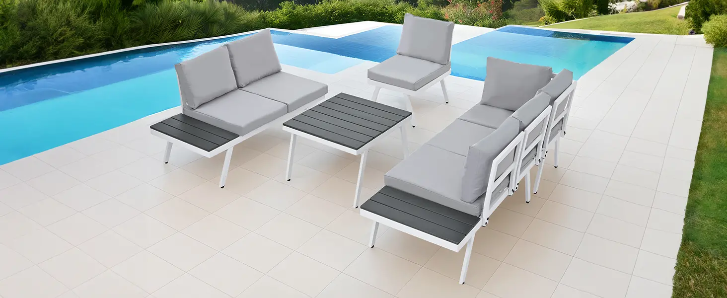Modular instructure sofa ensembles with a sectional configuration comprising of 2 loveseats, 1 armless seat, 1 corner seat, and 1table, tailor-made for luxurious outdoor relaxation.You can create the perfect outdoor living space, no matter the size or layout of your yard.