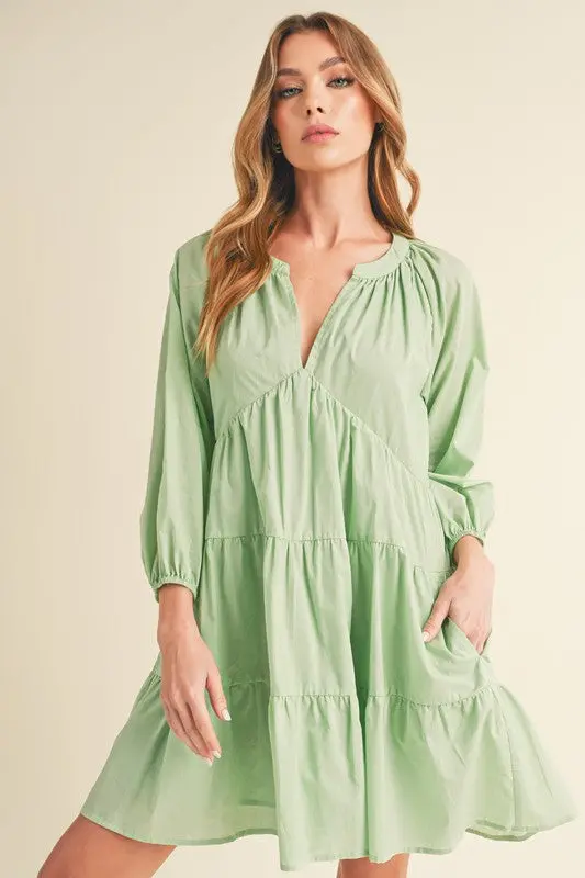 Effortless and chic Jenay dress features a flattering V-neck, a swing shape for easy movement, and 3/4 sleeves for a touch of elegance. The tiered design adds playful flair, while pockets offer both style and convenience.