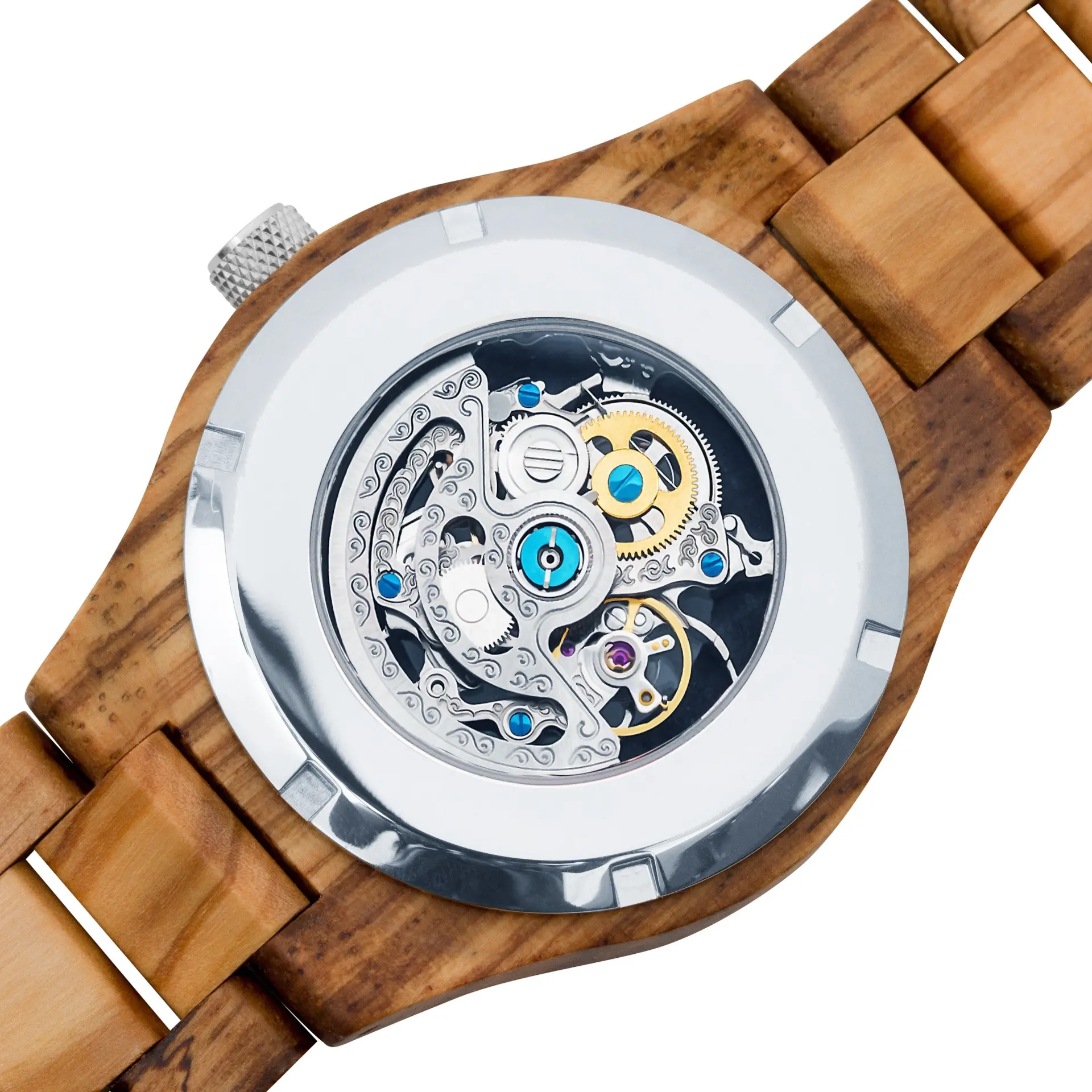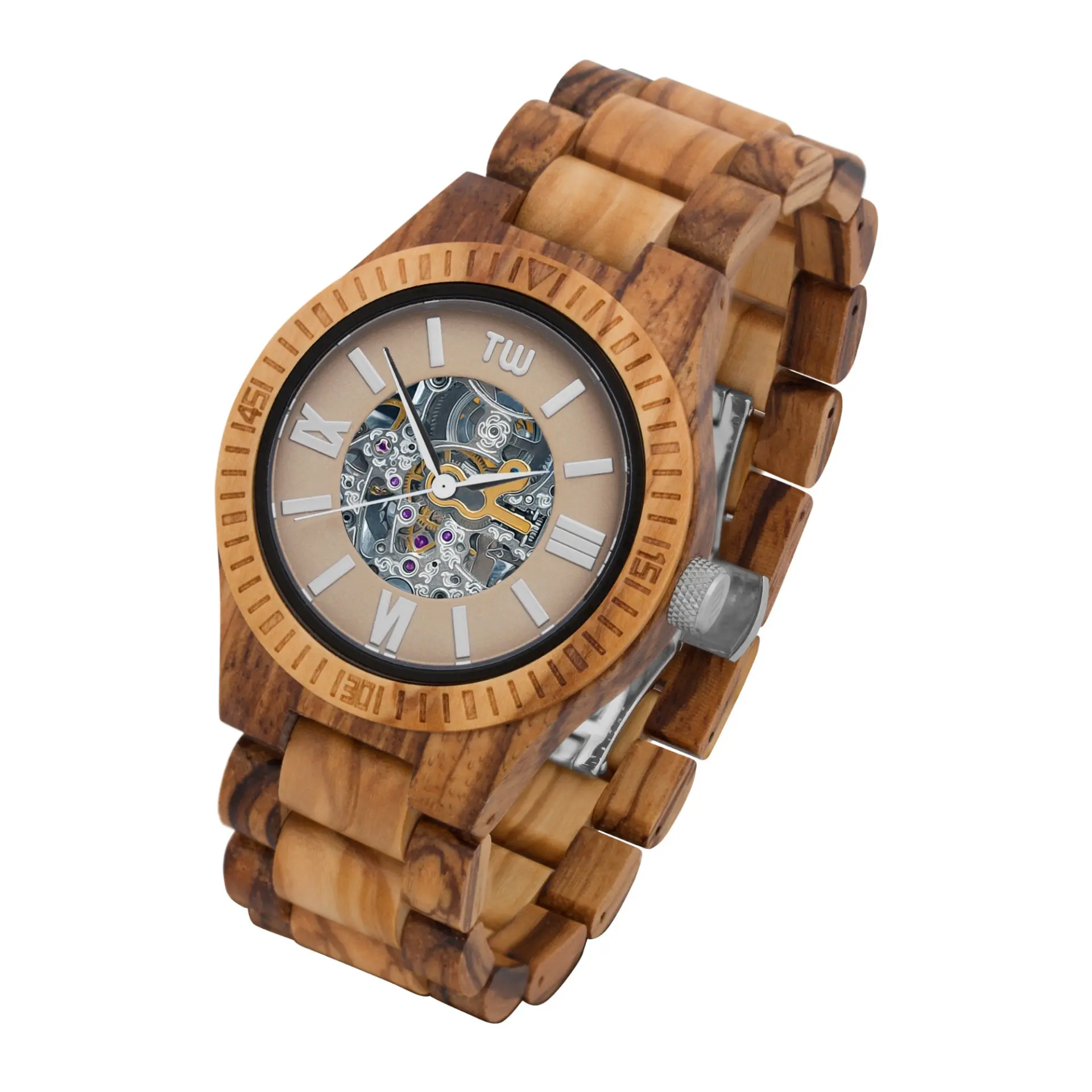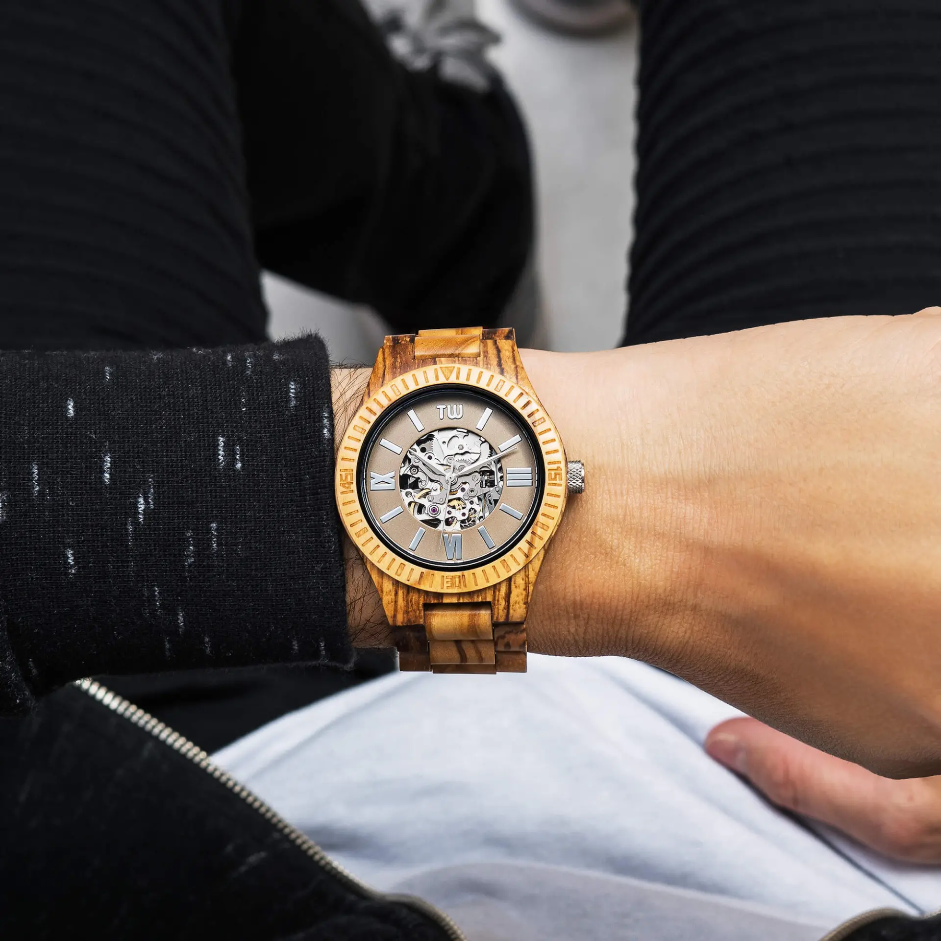 For the man who understands the importance of looking his best, this elegant timepiece is the top choice. Featuring an automatic self-winding movement housed in a sapphire coated mineral glass, the Journey is a marvel in modern watch engineering. Stare into the sophisticated motion of exposed gears and rotors on the see-through skeleton dial as every second ticks by. Carefully handcrafted with two tone zebrawood and olive wood, the polished dual colour wooden link band is held together by a classic butterfly clasp. This watch rests with an indescribable elegance on your wrist to give the top luxury watch brands a run for their money.