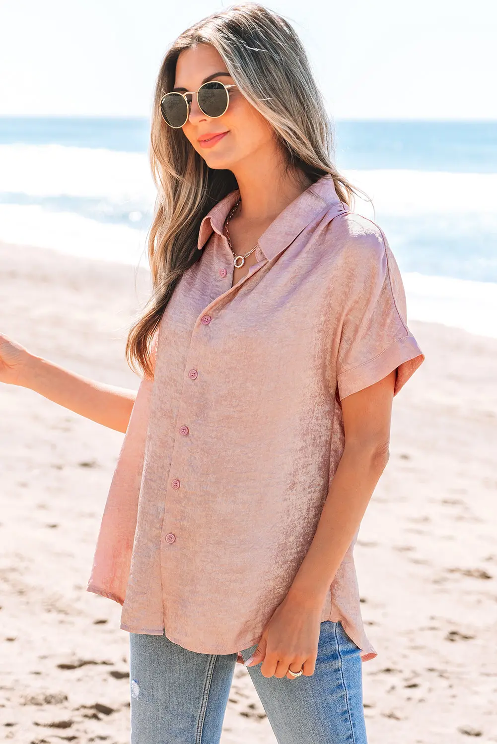 Kiana Metallic Buttoned Loose Fit Short Sleeve Shirt