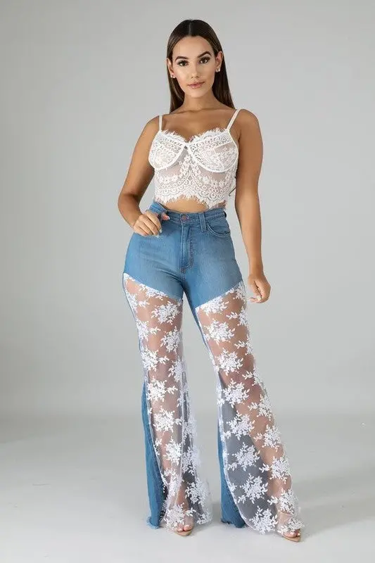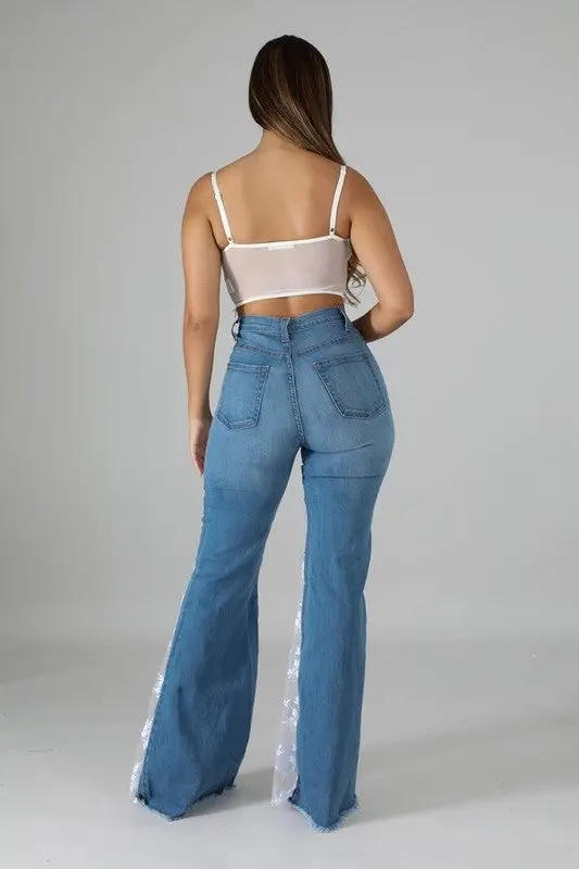Full Length Flare Denim Jean features front pockets, front zipper and button closure, front White Lace, Medium Blue, Stretch denim, Made in Los Angeles