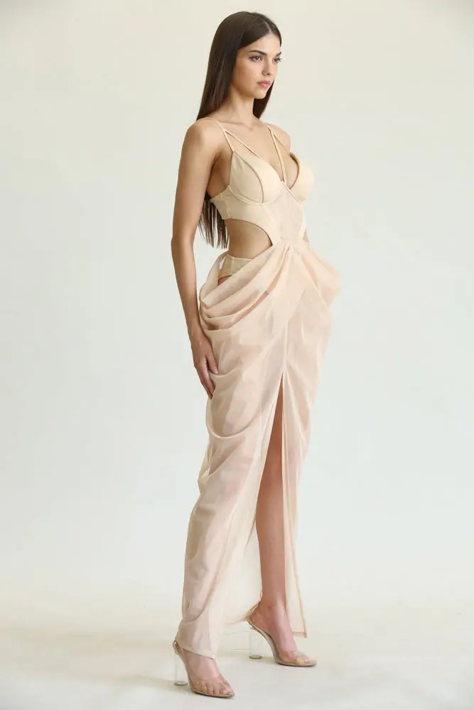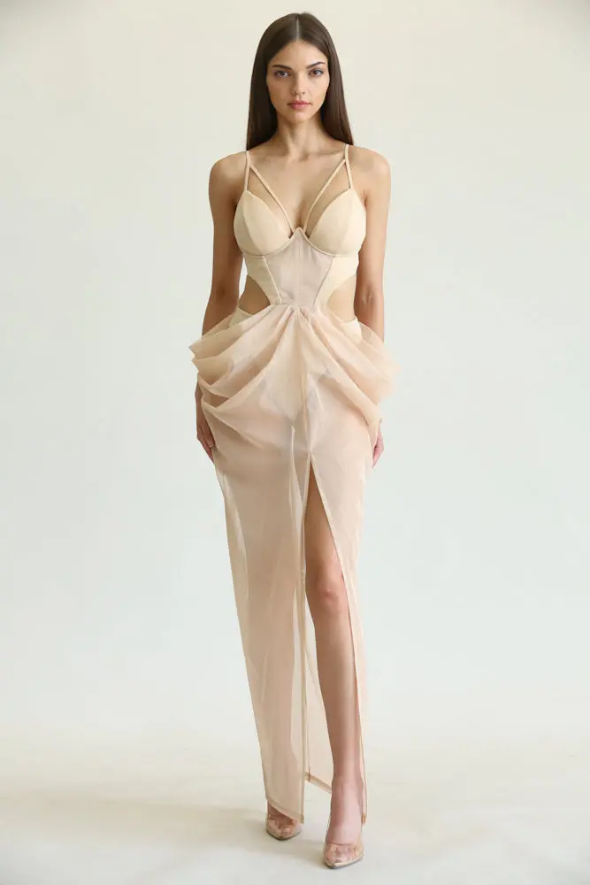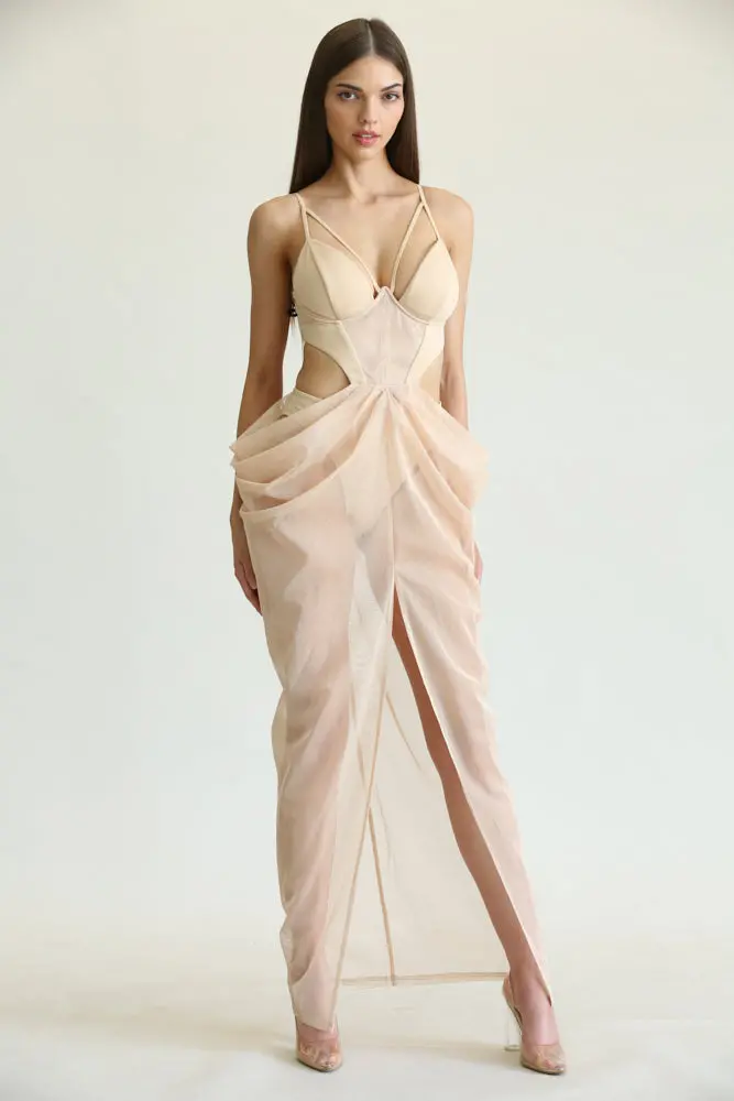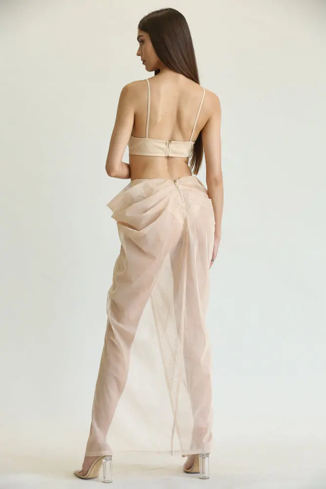 -ORGANZAMESH ATTACHED SKIRT WITH PLEAT + DRAPE DETAIL