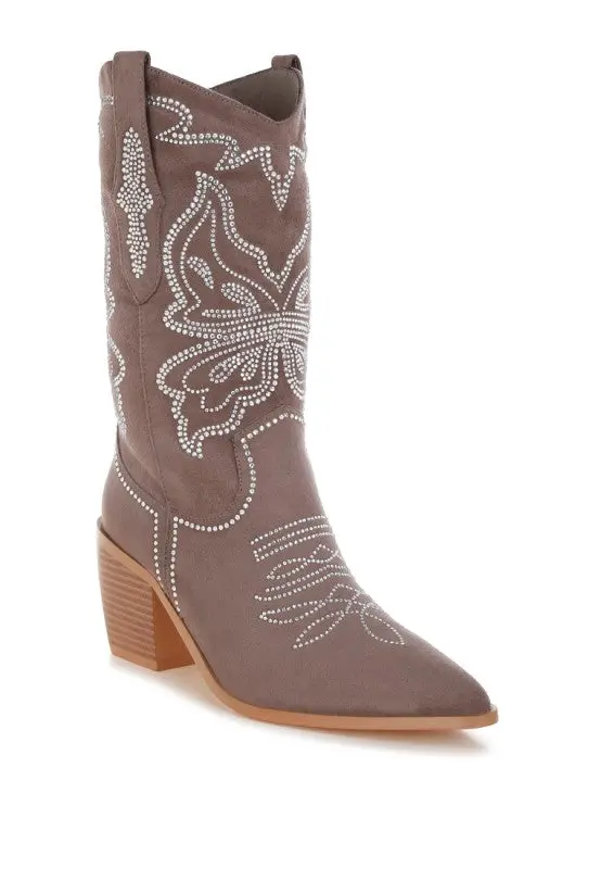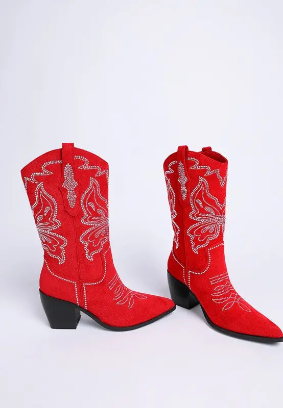 Taking glamour to new heights, the rhinestones embellished cowboy boots are elegant yet glamorous with the beautiful patterned rhinestones embellishments which make a distinctive impression with their shine. The block heel boots have a classic construction which have a timeless flair. The comfortable cushion insoles cut strain and offer a relaxed fit.