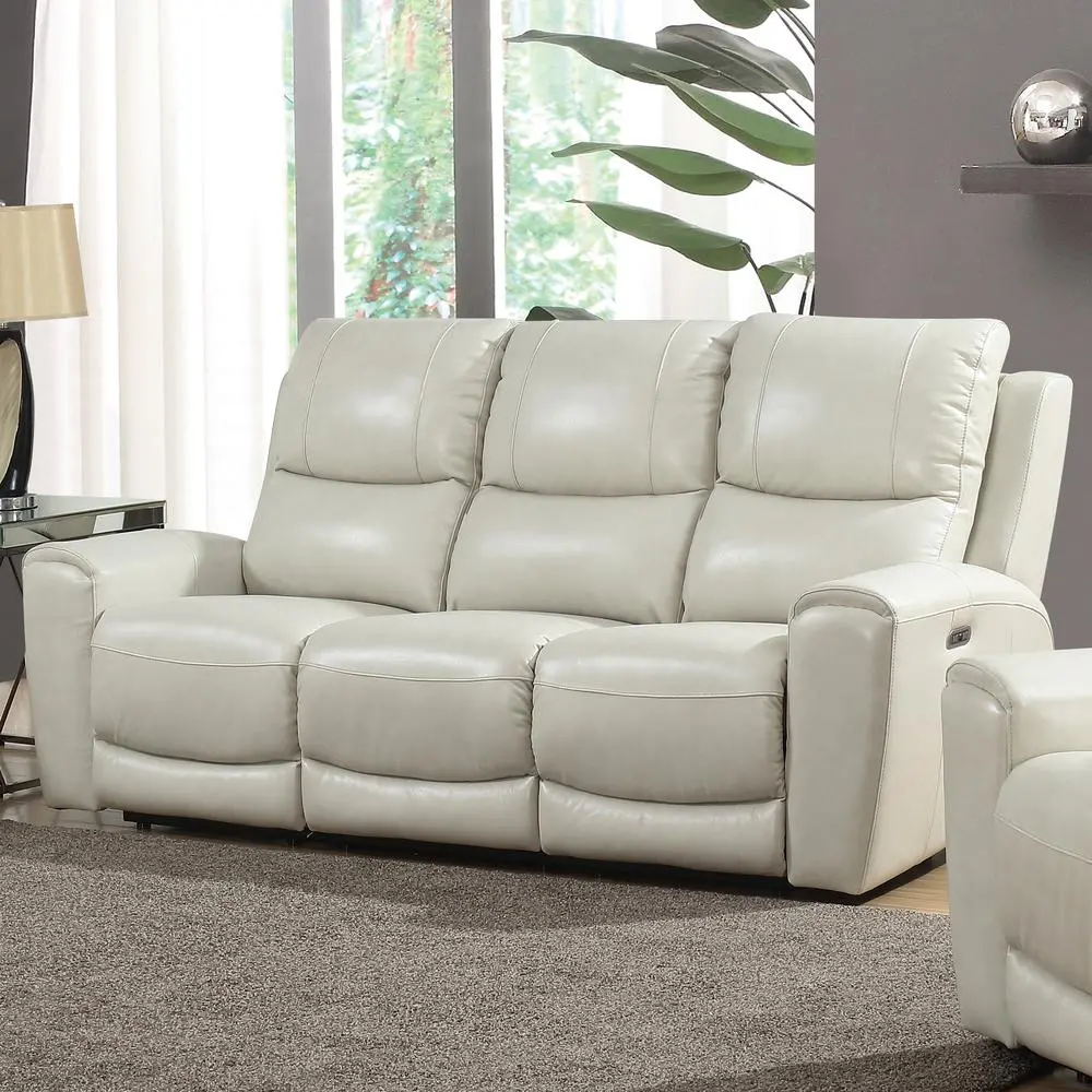 Contemporary styled reclining collection constructed in leather with power leg rest and power articulating headrest. The Laurel Power Reclining Sofa features both styling and convenience with USB charging port on the control panel along with a home button to return the piece to its original position. Double reclining seats for ease of achieving your own level of comfort. Available in Grey or Ivory
