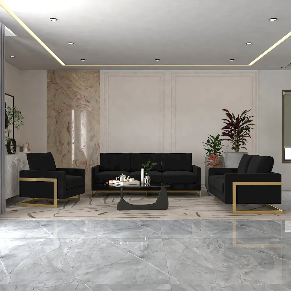 The set includes a three-seater sofa, a loveseat, and an accent chair, offering ample seating for up to six people. Its versatile design accommodates various spaces, with proportions and construction tailored for living rooms, lounges, or offices. The sofa set features high-quality velvet upholstery, known for its soft feel and elegant look. The durable fabric stands up to daily use without fading or wearing out, keeping its vibrant color and smooth finish for years to come. The seat and back cushions are filled with high-density foam, offering firm support that retains its shape over time, ensuring both comfort and durability. The sofa set features sturdy stainless steel legs with a polished gold mirrored finish, combining durability with a striking appearance The seat and back cushions are removable, designed with padding that provides a supportive and comfortable seating experience. The removable design makes cleaning simple and keeps the cushions looking fresh. The base is equipped with discreet plastic pads that act as a buffer to prevent scuffs or scratches on your floors This sofa set arrives fully assembled, eliminating the need for setup and ensuring you can enjoy its features as soon as its delivered.