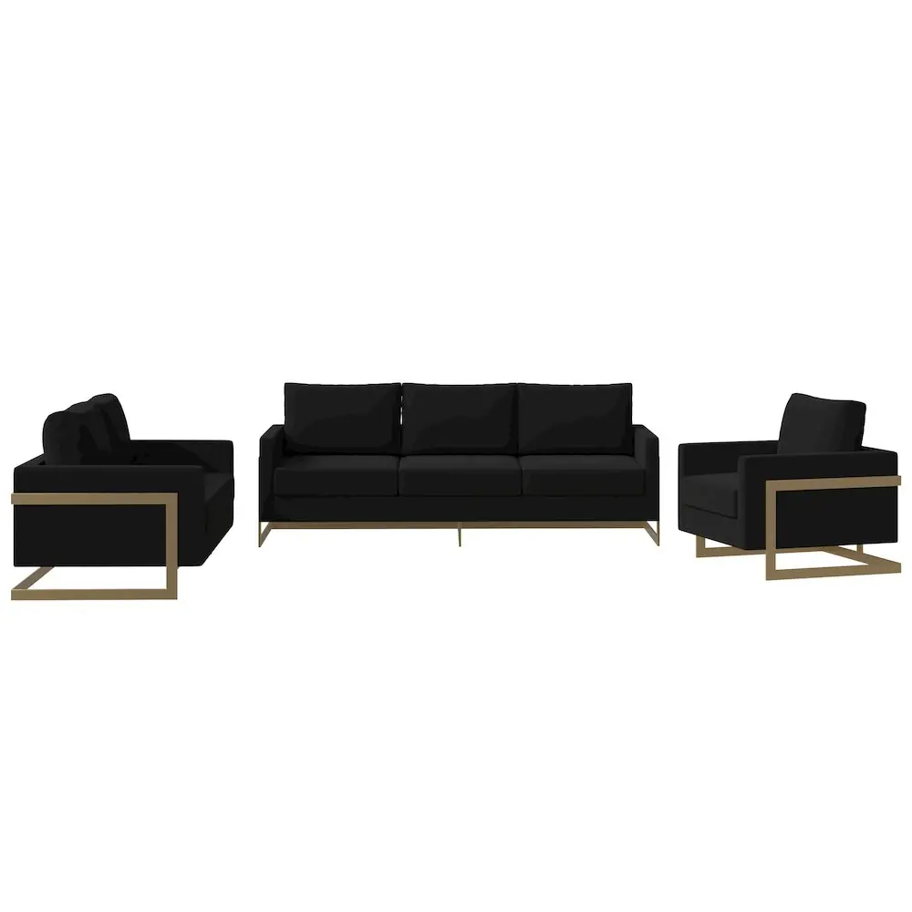 Bring timeless elegance and modern functionality to your home with the LeisureMod Lincoln 3-Piece Velvet Sofa Set. Featuring a three-seater sofa, loveseat, and accent chair, this set comfortably seats six and transforms any space into a statement of style. The soft velvet upholstery offers a luxurious feel, while its fade-resistant fabric retains vibrant color and a smooth finish over time. High-density foam cushions deliver firm support and lasting comfort, with a removable design for easy care. Polished gold mirrored stainless steel legs with a sled base provide stability and a bold, contemporary touch. Protective plastic pads guard floors from scratches, and the fully assembled set is ready to enhance your living room, lounge, or office.