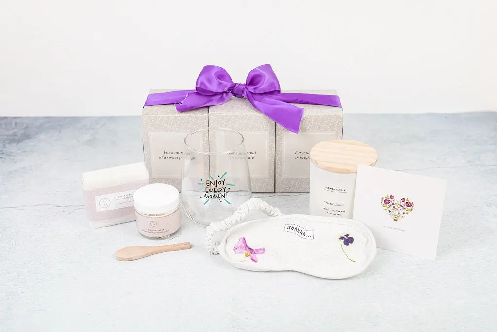 - COMPONENTS: This 3 Boxes Spa Gift Set includes: Enjoy every moment wine glass Large candle with wooden lid – 8 oz Facial clay mask Natural Lavener soap Eye mask