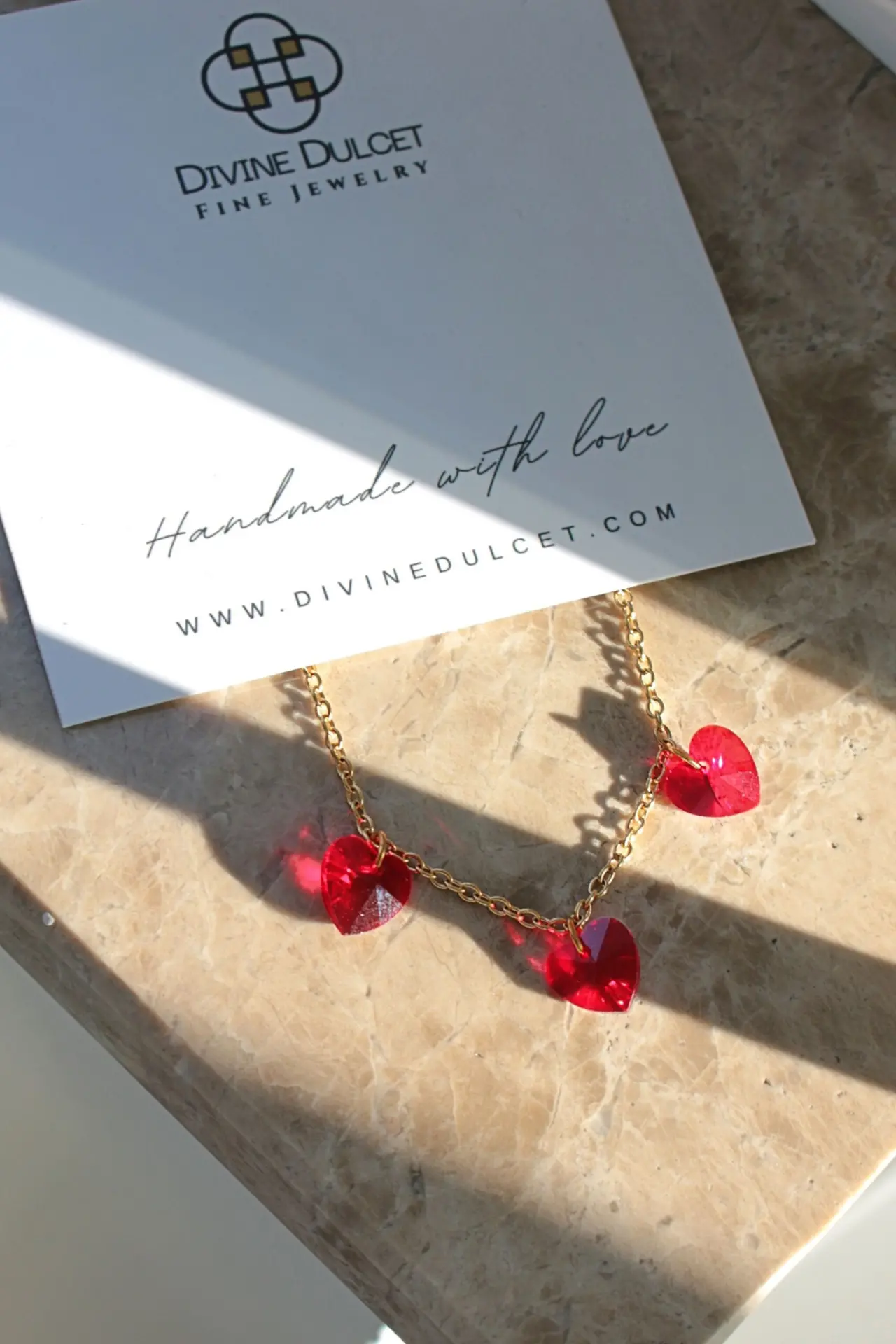 Adorable love inspired necklace with 3 red heart pendants made of glass crystal.