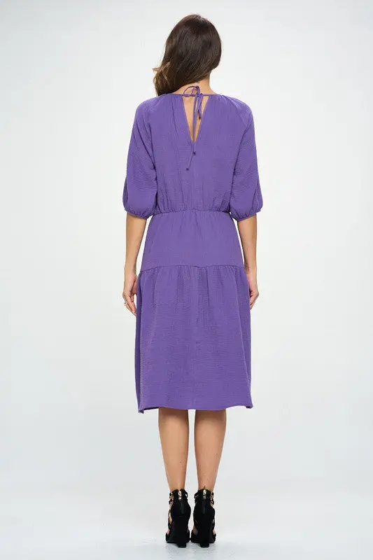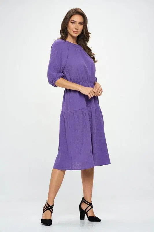 Made in USA Cotton 3/4 Sleeve Tiered Midi Dress. Fabric content: 100% Cotton. Available in other Colors.