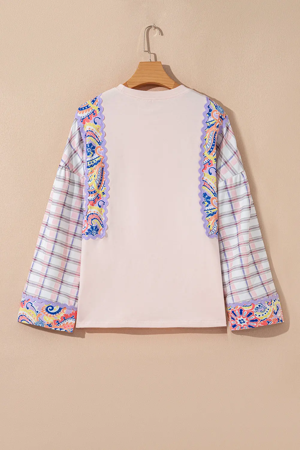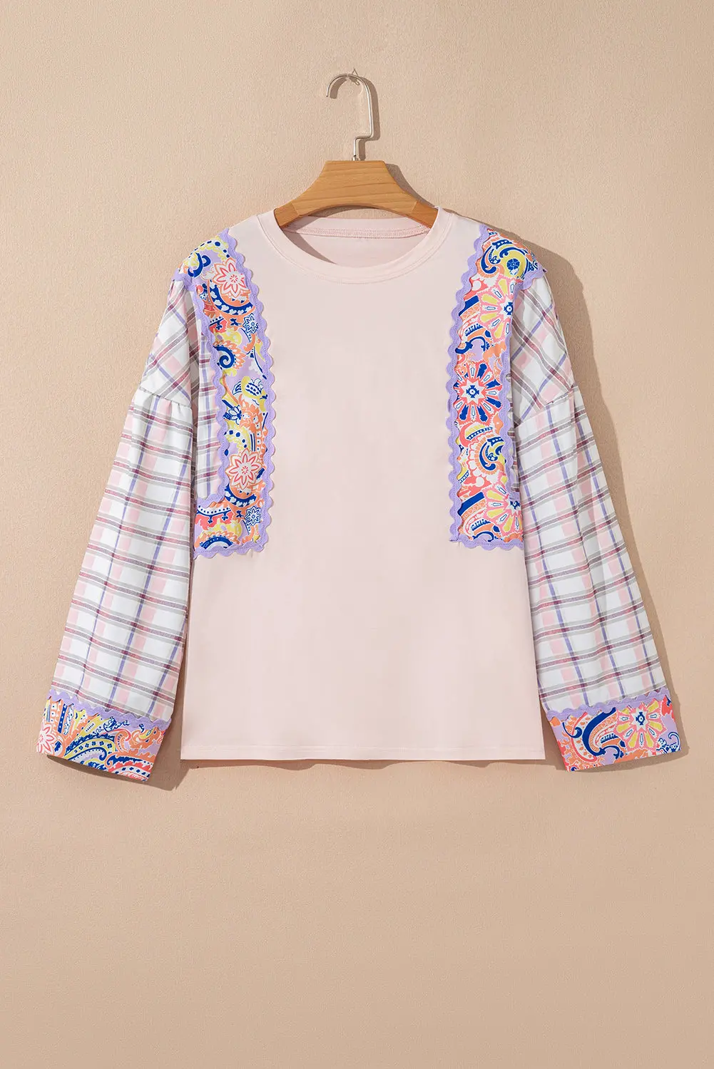 This blouse features a whimsical ricrac trim that brings a fun, retro vibe. Its mix of floral and plaid patchwork gives it a lively, boho flair. Puffy sleeves add extra volume and a sweet, romantic feel. Made from lightweight fabric, it delivers comfort alongside eye-catching style.