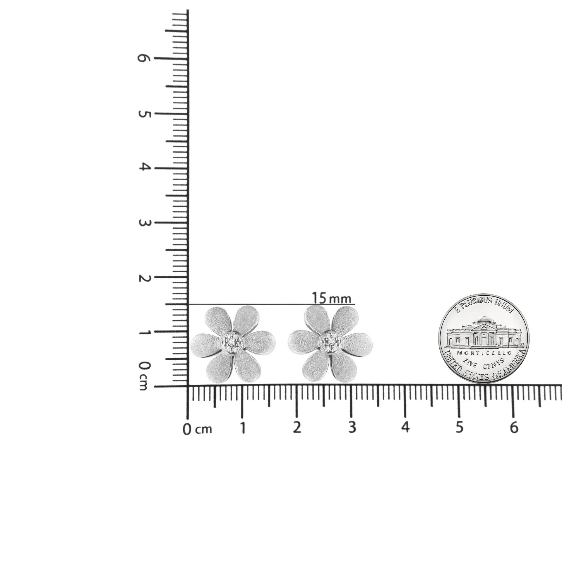 Celebrate your blooming love with these adorable diamond flower earrings made from .925 sterling silver and given a matte finish. Charming style for your sweetheart, these sterling silver floral earrings are embellished by a cluster of 10 pave set single cut accent diamonds at the center. These blossoms closes with a secure clasp. Total diamond weight is 1/20 ctw.