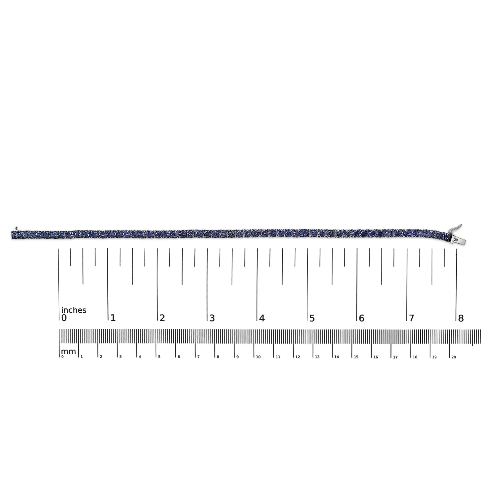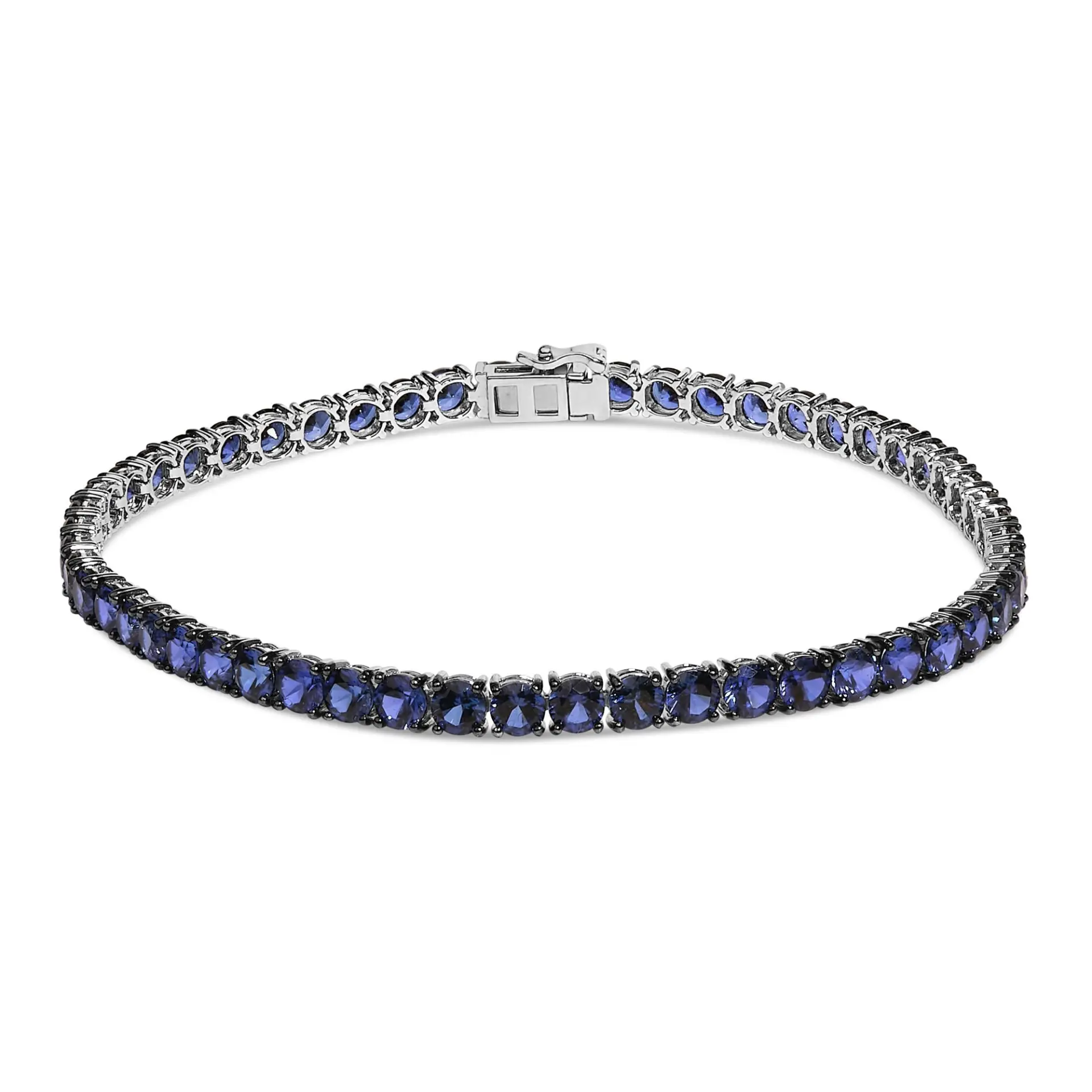 Immerse yourself in the exquisite elegance of this .925 sterling silver bracelet, an epitome of sophisticated craftsmanship designed for the modern man. Rhodium-plated to enhance durability and prevent tarnish, this piece promises an enduring brilliance. Flaunting a classic tennis bracelet silhouette, it is meticulously adorned with lab-created, color-treated blue sapphires that captivate with their vibrant hue. Each 4×4 mm gemstone is precisely nestled in a 4-prong setting with distinctive black rhodium accents, creating a striking visual contrast that dances with light. Measuring 8.5 inches, it drapes gracefully around the wrist, offering a comfortable fit and an unmistakable statement of style. This masterpiece not only embodies luxury but also celebrates a refined aesthetic with its bold gemstone presence and meticulous attention to detail.