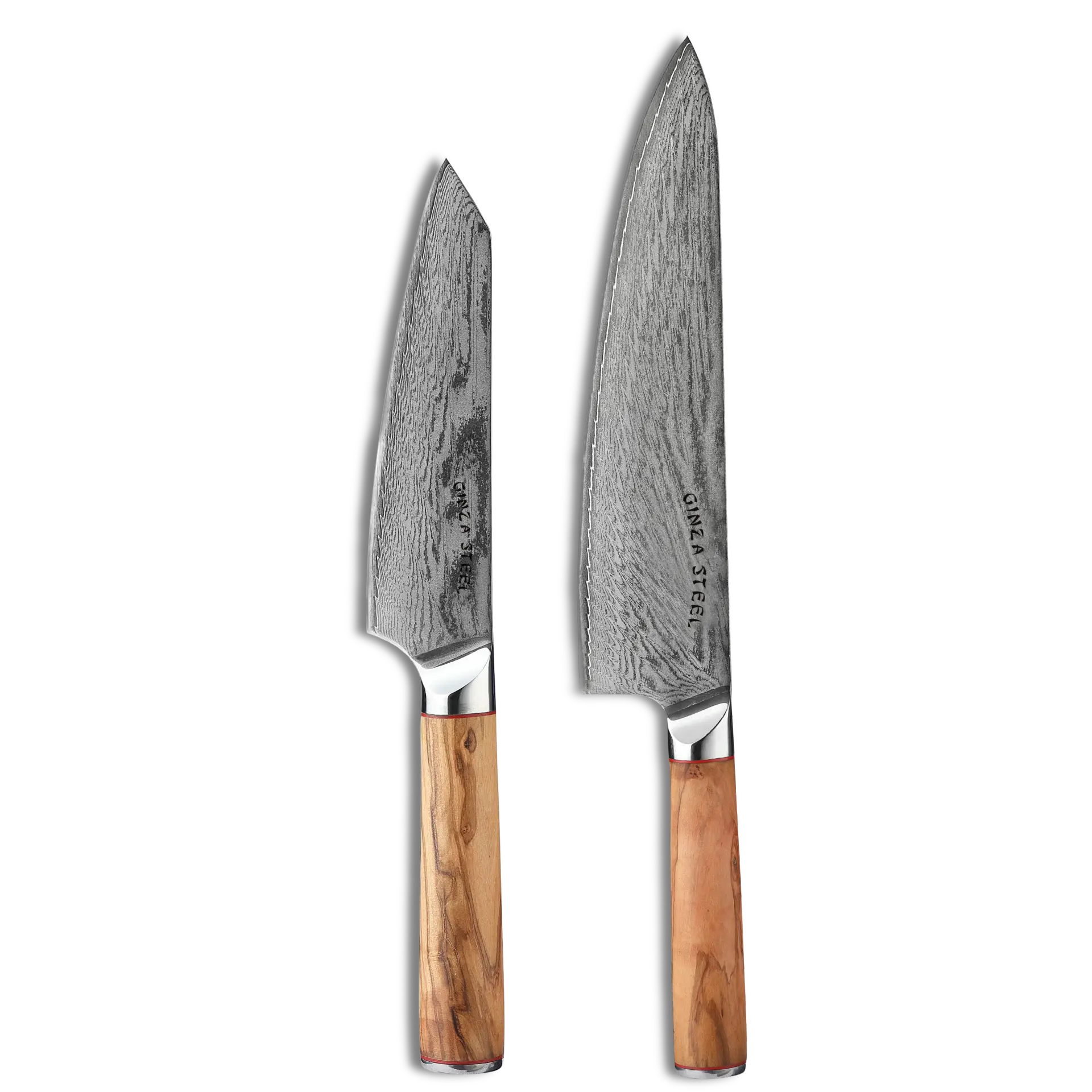 Crafted with precision, the KC Series MIA TWO Chef Knife Set combines exquisite design with exceptional functionality. Each knife features a Damascus steel core blade, renowned for its strength and durability. The blades are complemented by ultra-premium Italian Olive Wood handles, offering a comfortable grip and a touch of elegance to your kitchen.