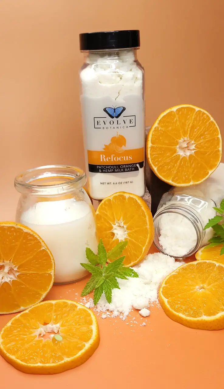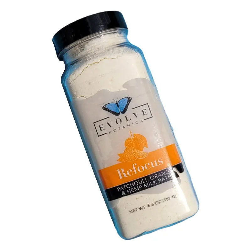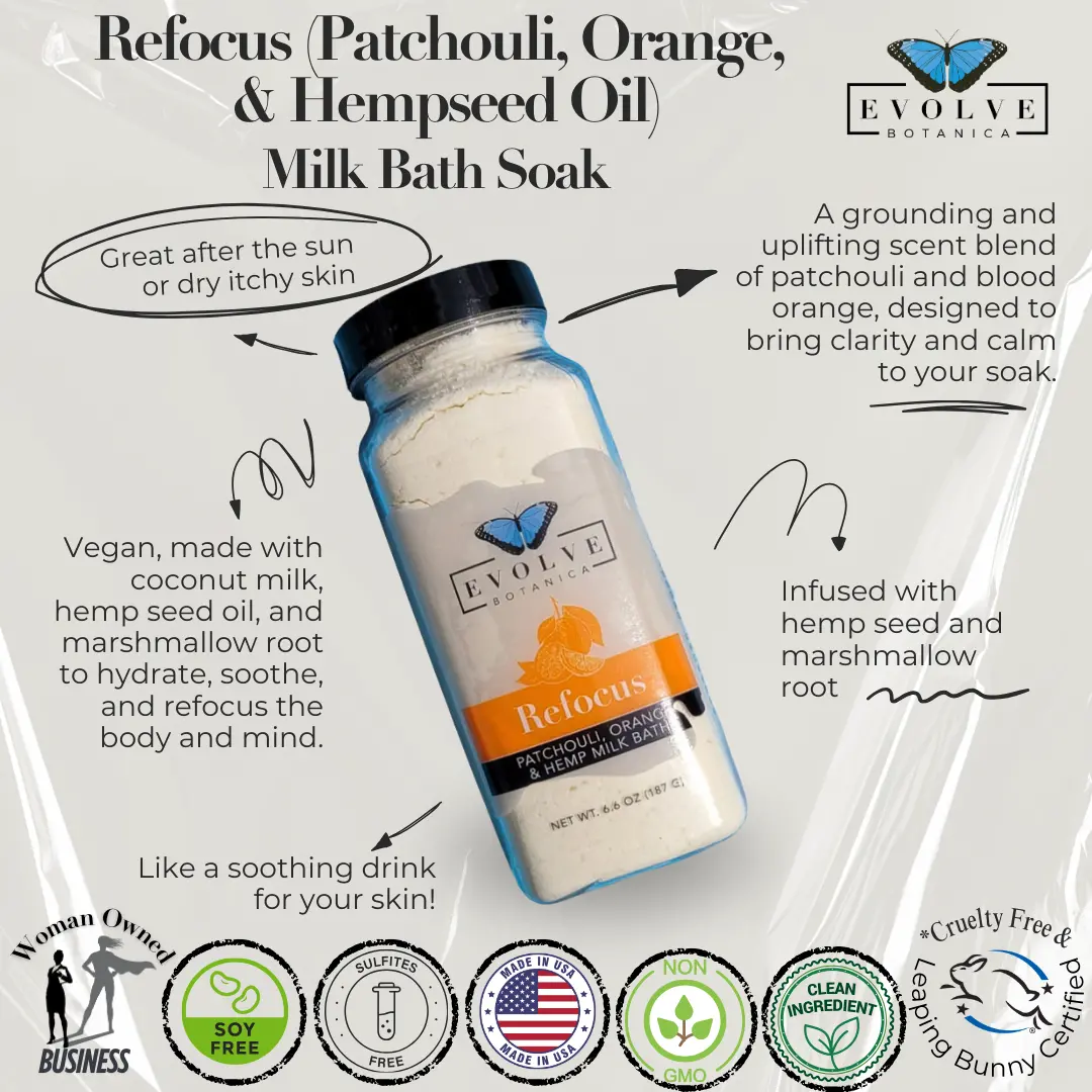 Treat yourself with this luxurious vegan bath milk. This refocus blend contains skin-softening coconut milk, grounding patchouli oil, uplifting orange oil, and moisturizing hemp seed oil. Each package contains approximately 2-3 baths.Due to the handmade nature of our natural products, colors may vary from batch to batch.
