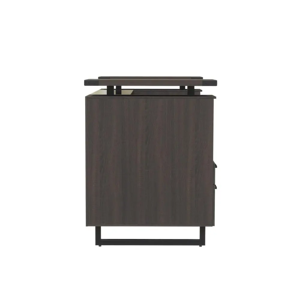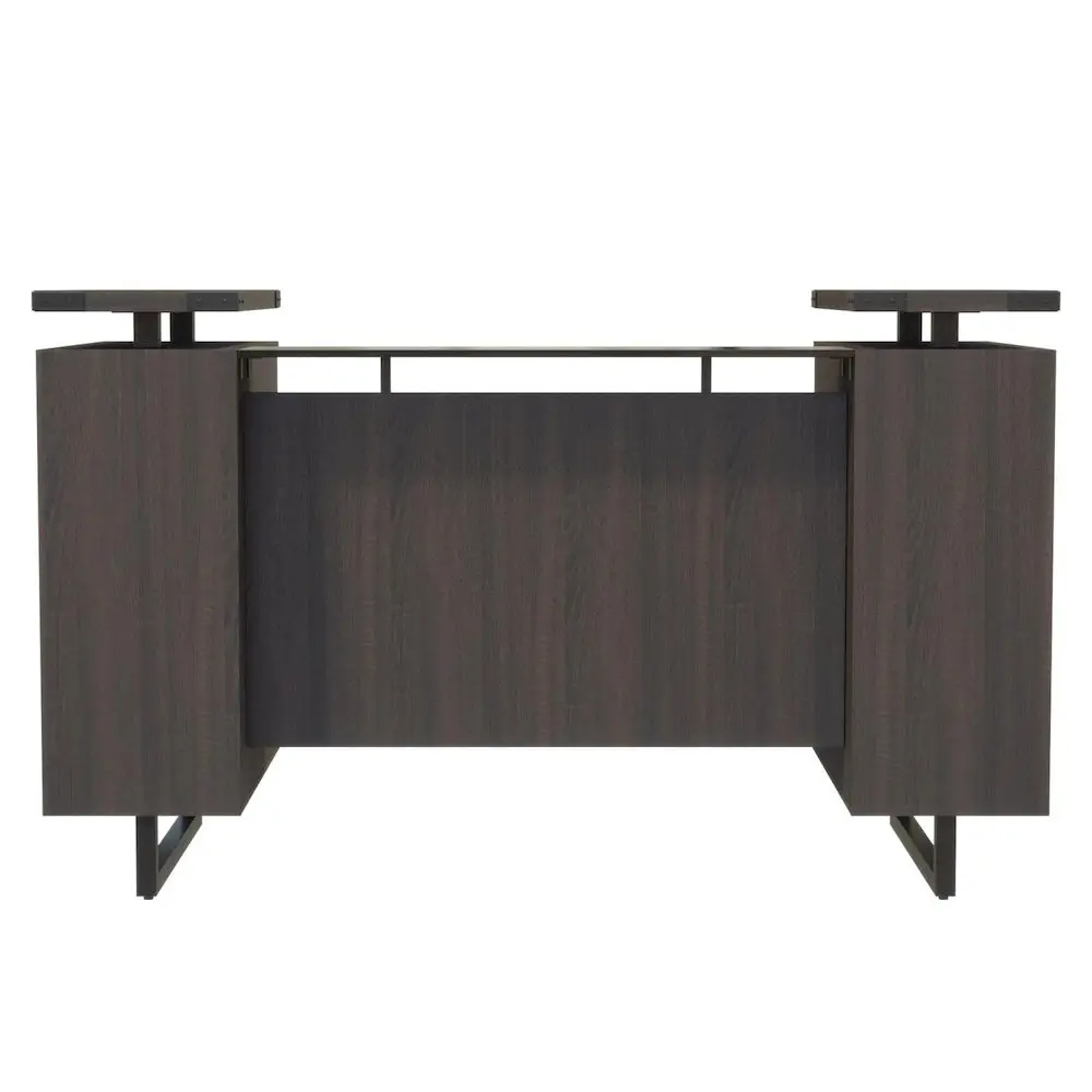 Mirella Reception Desk with Glass Countertop features a contemporary design that provides a residential look, complemented with Brushed-Silver or Black Powder Coat accents and finishes. Sand Dune and Southern Tobacco laminates come with Black hardware and Smoked Glass, and White Ash and Stone Gray laminates come with Silver hardware and Frosted Glass. Features floating glass countertops on Silver or Black standoffs. The thick tempered-glass reception counter and the 1 thick laminate desktop are sure to convey the right message to all of your companys visitors. Includes laminate modesty panel for additional privacy, and center drawer. Comes complete with double, shelf/box/file pedestals for all your storage needs. Coordinates with Mirella Desking and Conference designs for a cohesive and professional look.