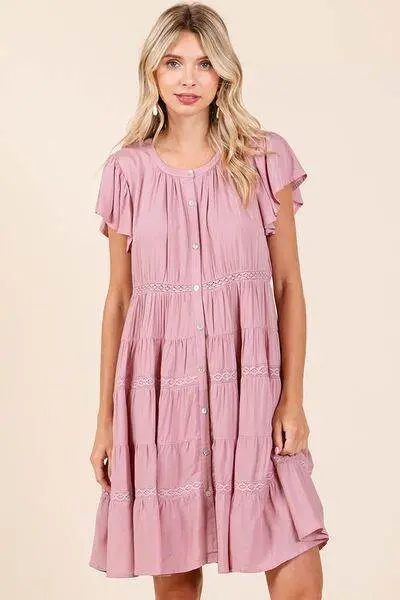 The Lace Detail Ruffled Button Down Tiered Dress is a romantic and elegant choice for a feminine outfit. The lace detailing adds a delicate and charming touch, while the ruffled tiers create a flowy and flattering silhouette. Perfect for special occasions or a dressed-up daytime look, this dress exudes a whimsical and ethereal vibe that is sure to make a statement. Pair it with heels and delicate jewelry for a sophisticated and graceful ensemble that captures a sense of effortless beauty.