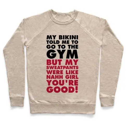 MY BIKINI SAYS GYM BUT MY SWEATPANTS SAY COUCH CREWNECK SWEATSHIRT