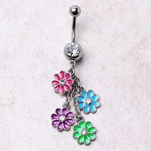 316L Navel Ring with Multi Color Daisy Dangle. Finest Cubic Zirconia beautifully set on trustworthy 316L Surgical Steel. Superior quality product!!