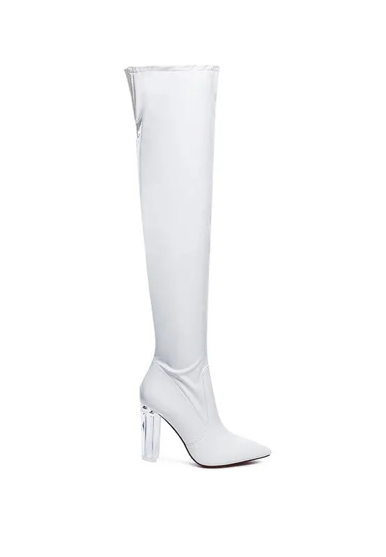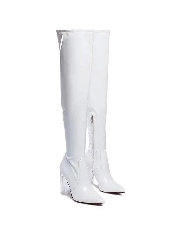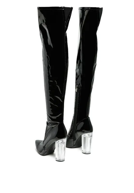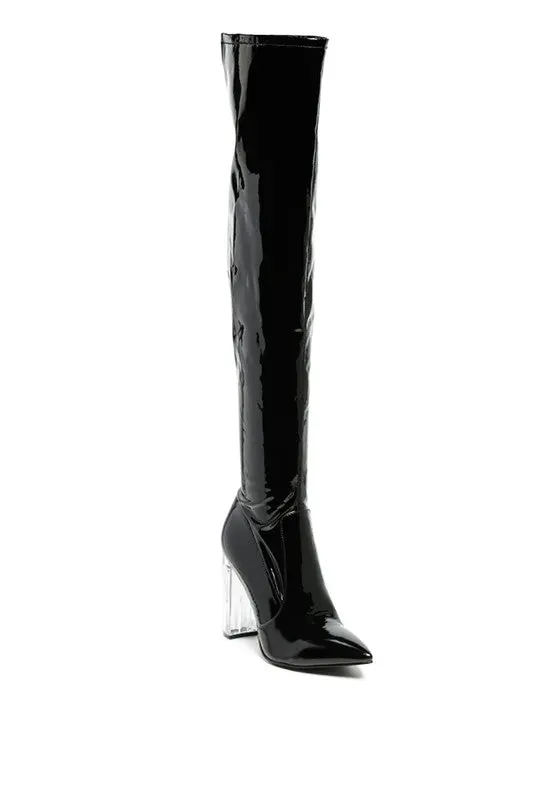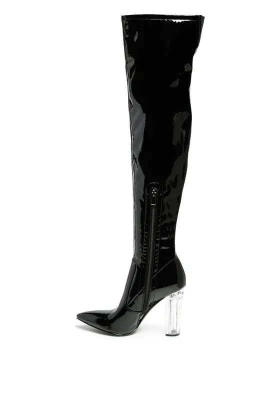 With clear block heels – this pair of patent PU thigh high boots scream style all way round. The pointed toe beauties seem to add some spark to grey winter moods.