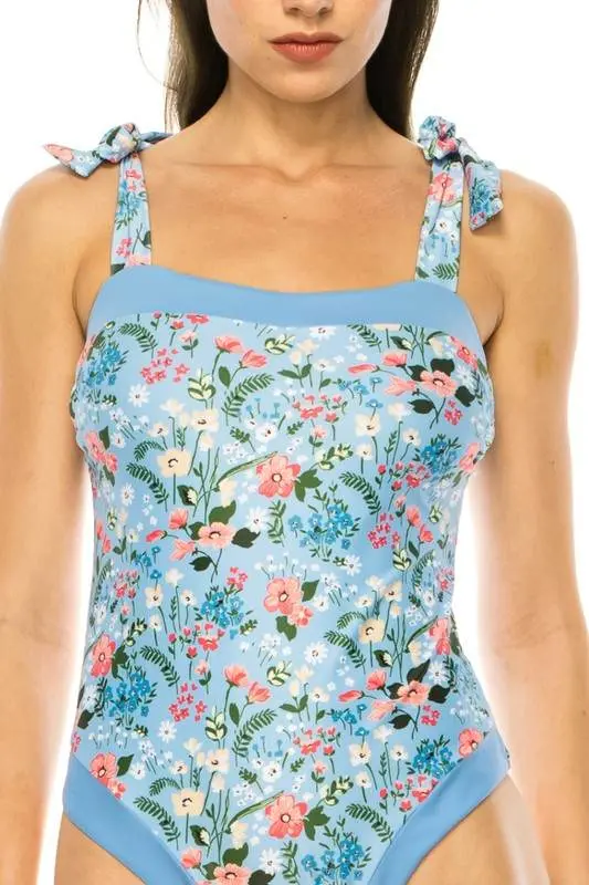 ONE PIECE BATHING SUIT FLORAL PRINT SHOULER TOP TI