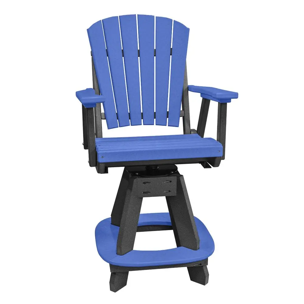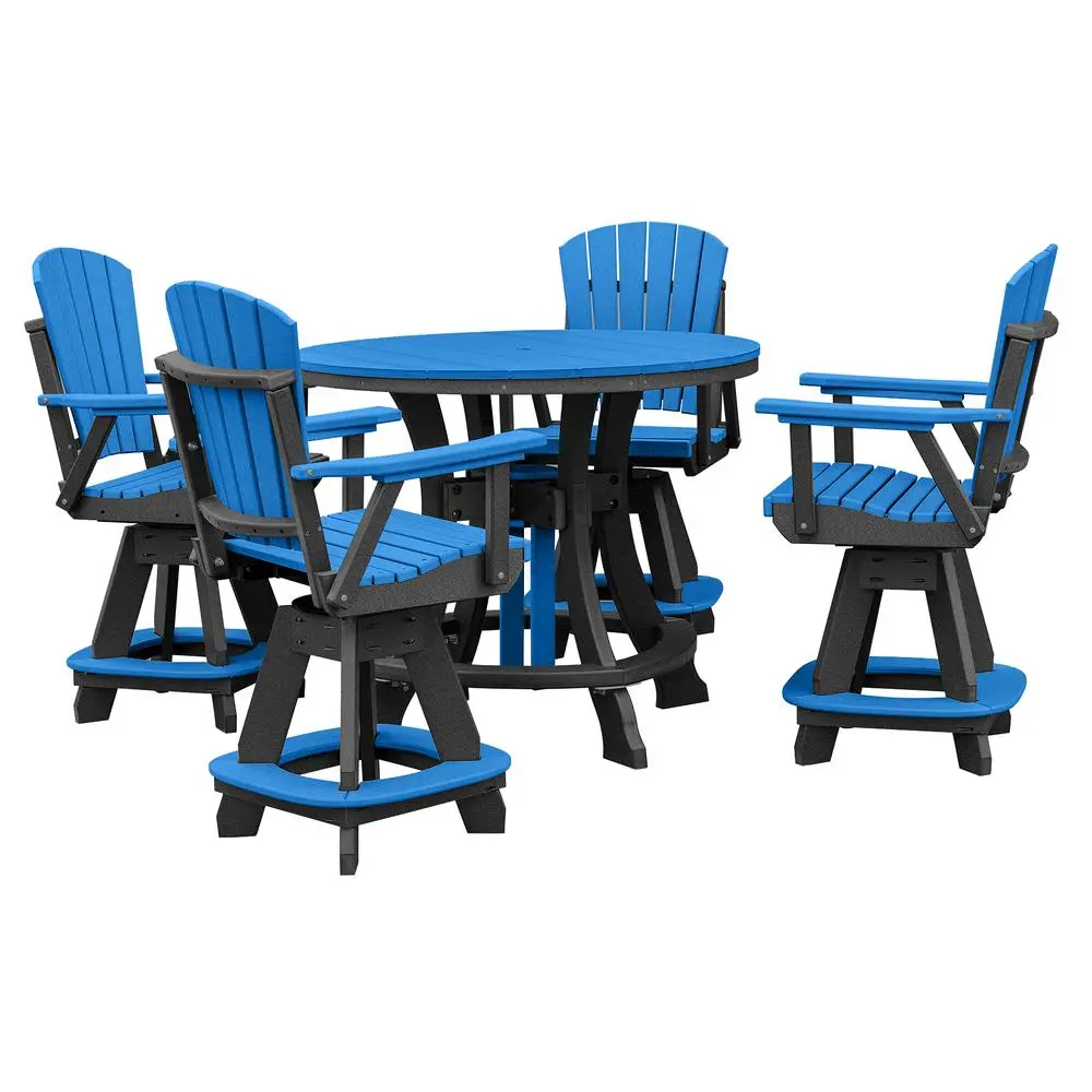 Enjoy our patio and outdoor furniture assortment for years and years. This heavy duty round counter height table and counter height fan back swivel arm chairs feature our Blue colored seat and back on a black base. Every item is made of high-density recycled poly resin infused with UV stabilized colored plastic. This material is UV fading resistant, water resistant, extremely durable and built to last. All hardware is made of stainless steel and our swivel mechanism is made in the USA. Proudly made by the Amish community in Indiana, United States.