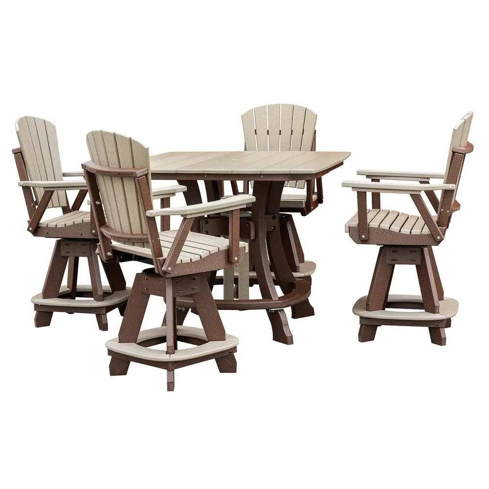 Enjoy our patio and outdoor furniture assortment for years and years. This heavy duty square counter height table and counter height fan back swivel arm chairs feature our Weatherwood colored seat and back on a Tudor Brown base. Every item is made of high-density recycled poly resin infused with UV stabilized colored plastic. This material is UV fading resistant, water resistant, extremely durable and built to last. All hardware is made of stainless steel and our swivel mechanism is made in the USA. Proudly made by the Amish community in Indiana, United States.