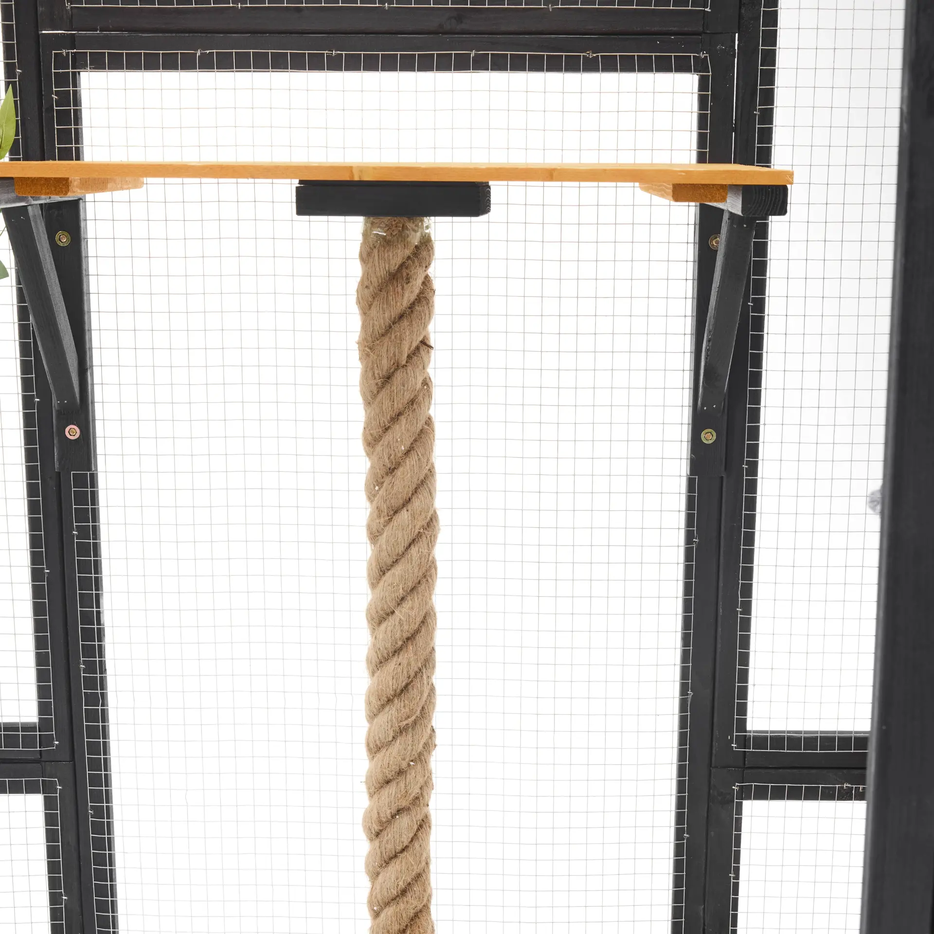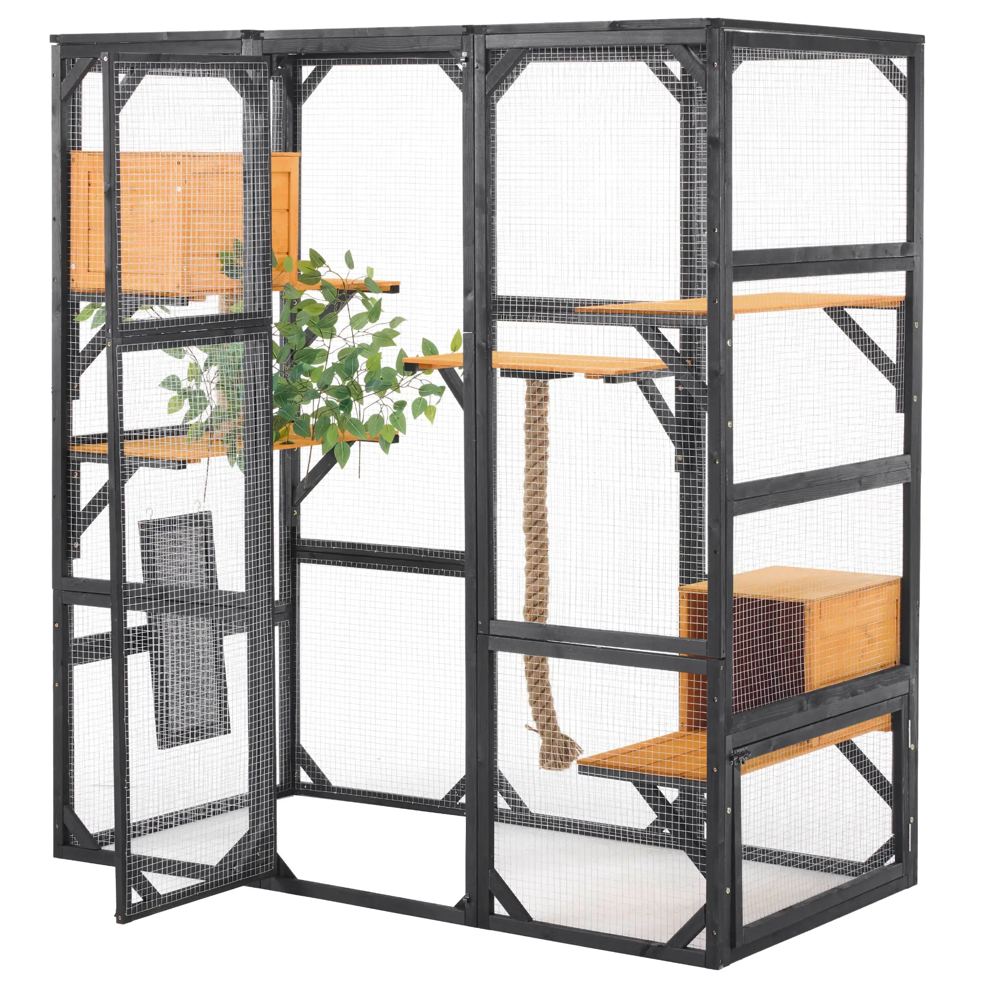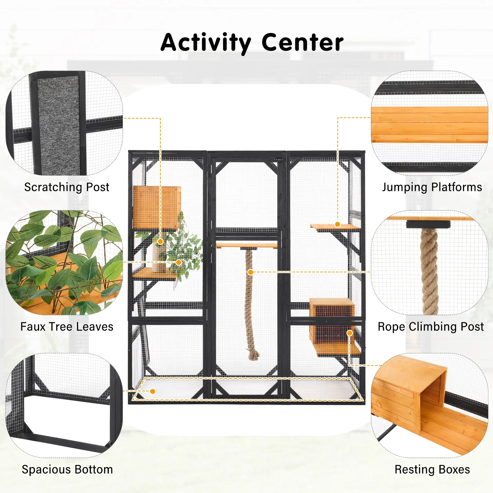 This outdoor walk-in cat enclosure offers a spacious and engaging environment for your cats, featuring multiple platforms for climbing, jumping, and exploring. It includes two cozy sleeping houses for privacy and rest, a rope climbing post, and a sturdy scratching post to satisfy your cats natural instincts. Built with high-quality pine wood and galvanized wire mesh, the enclosure is durable, weather-resistant, and ensures a safe space for your feline friends. The walk-in design, with easy access through front and back doors, allows for effortless interaction, cleaning, and feeding. Additionally, the faux tree leaves add a natural touch, creating a comfortable and stimulating environment that connects your cats to nature.