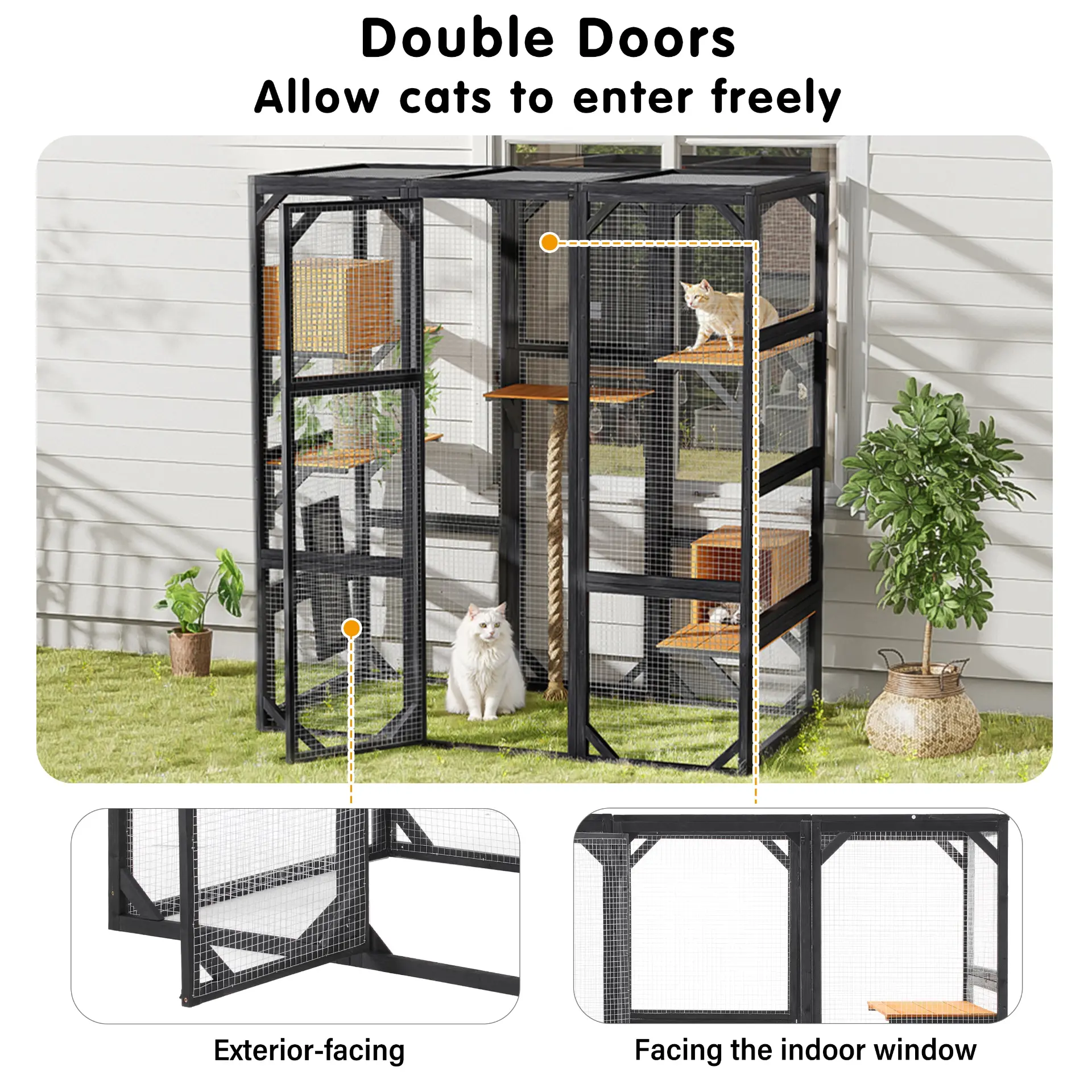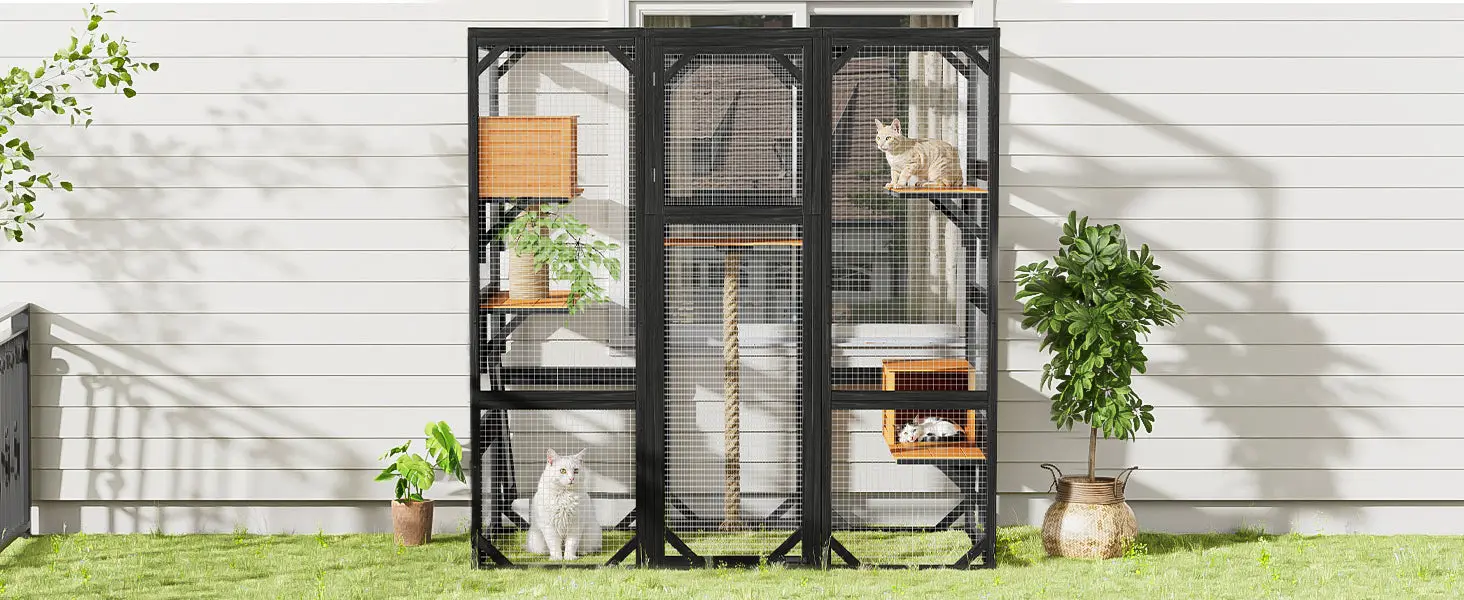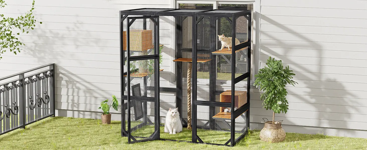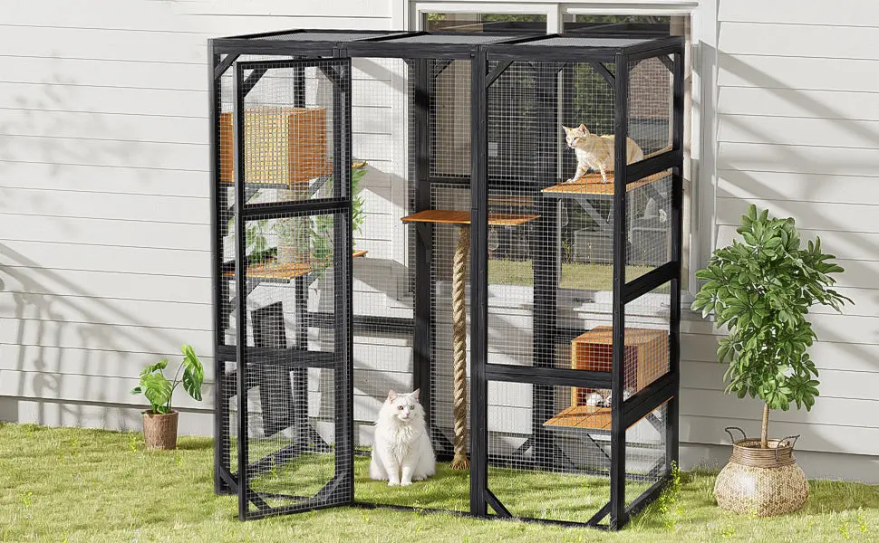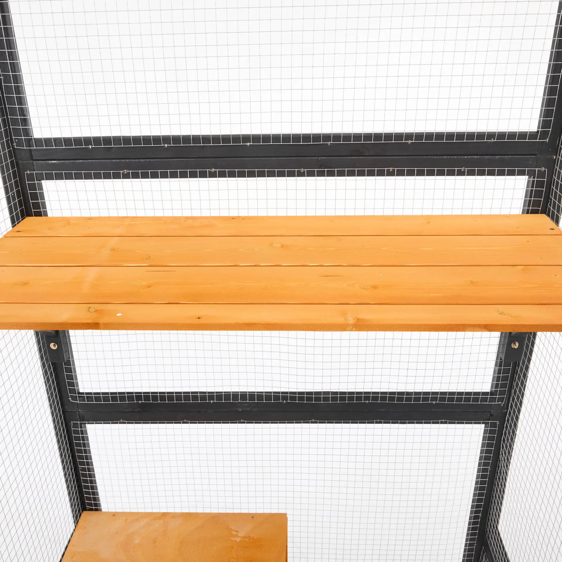 This outdoor walk-in cat enclosure is thoughtfully designed with three elevated platforms, providing generous space for your cat to leap, climb, and explore in a secure environment.