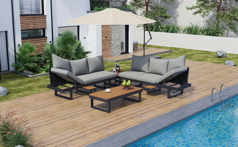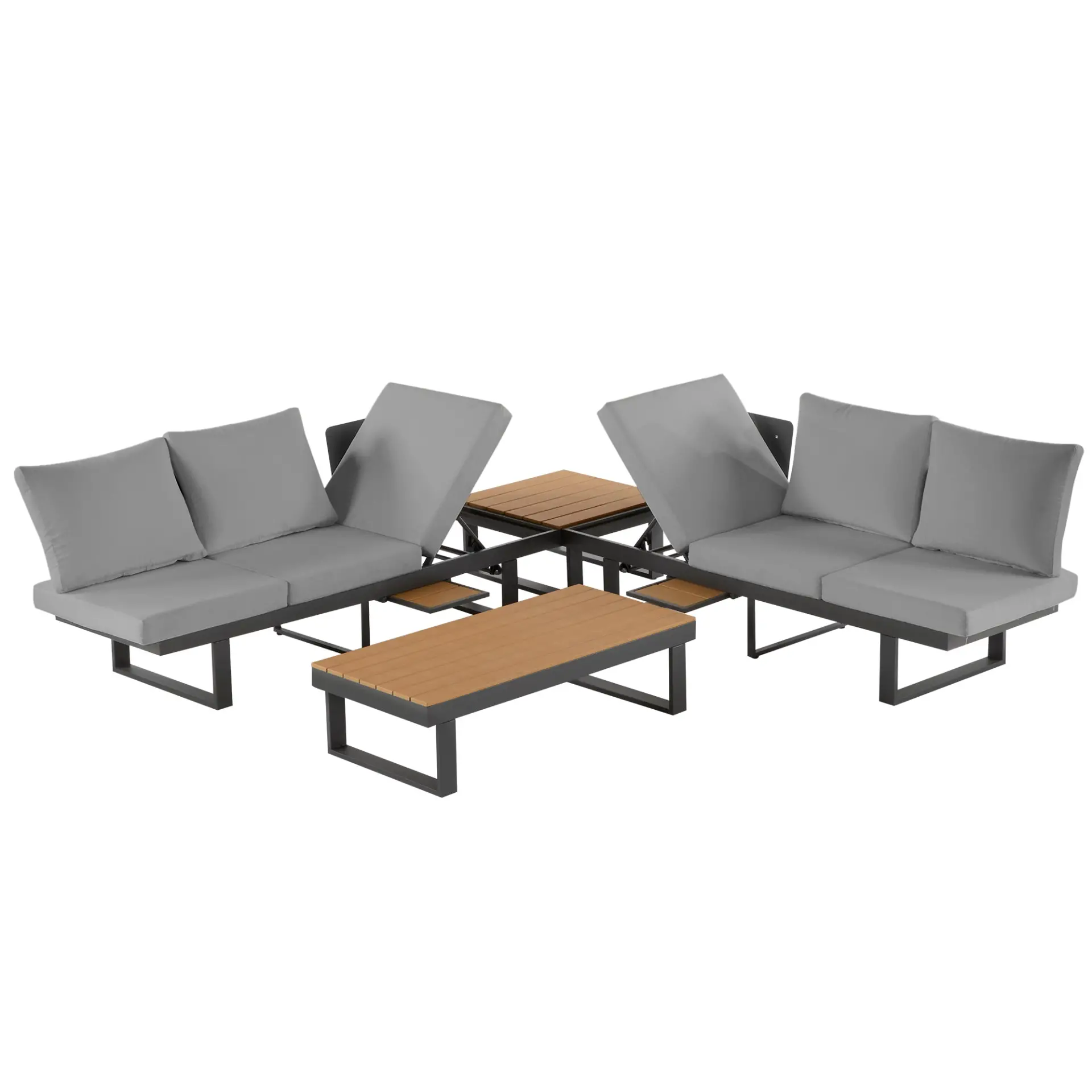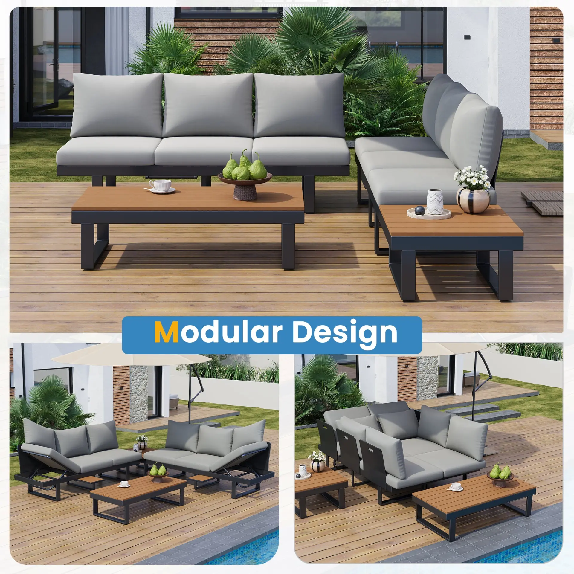 This versatile outdoor sofa set is designed for ultimate comfort and functionality, featuring adjustable seats with five reclining positions to suit any relaxation need. Its modular design allows for easy configuration between an L-shape or a straight-line layout, adapting seamlessly to different outdoor spaces. Built with a durable iron frame and weather-resistant WPC surfaces, this set ensures long-lasting performance against outdoor elements. The high-density sponge cushions wrapped in water-resistant fabric provide exceptional comfort and easy maintenance. Additionally, the set includes a spacious coffee table, a multifunctional small table, and hidden pull-out side tables, offering convenient storage and extra surface space for drinks, snacks, or decor. With a perfect balance of style, comfort, and practicality, this outdoor furniture set is an ideal choice for any patio, garden, or outdoor lounge area.