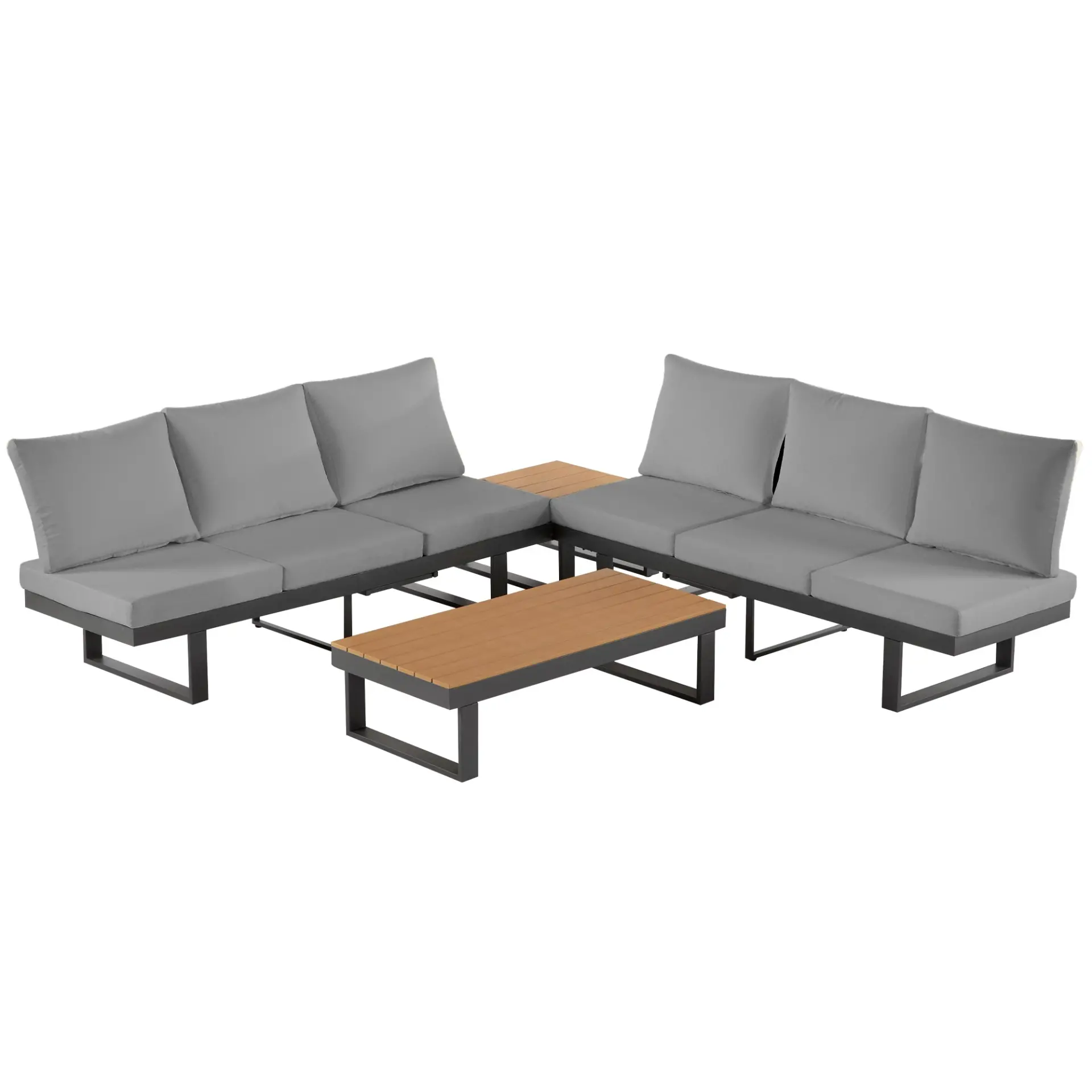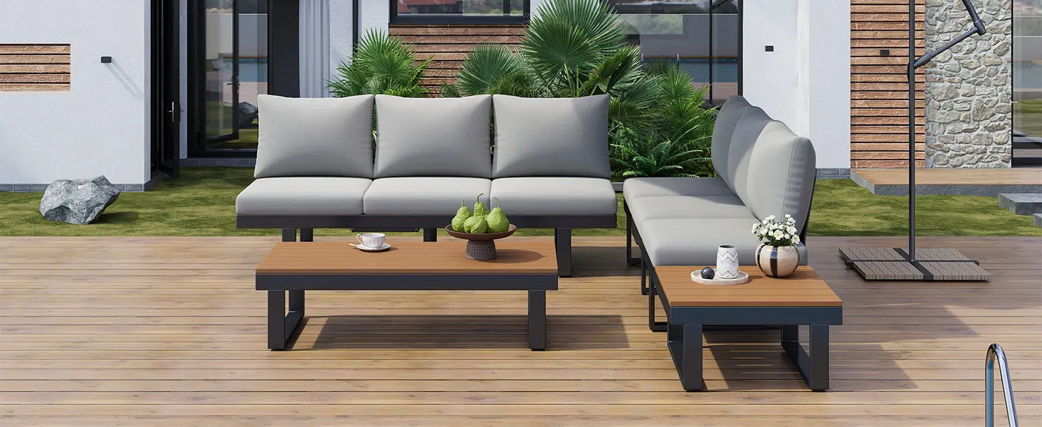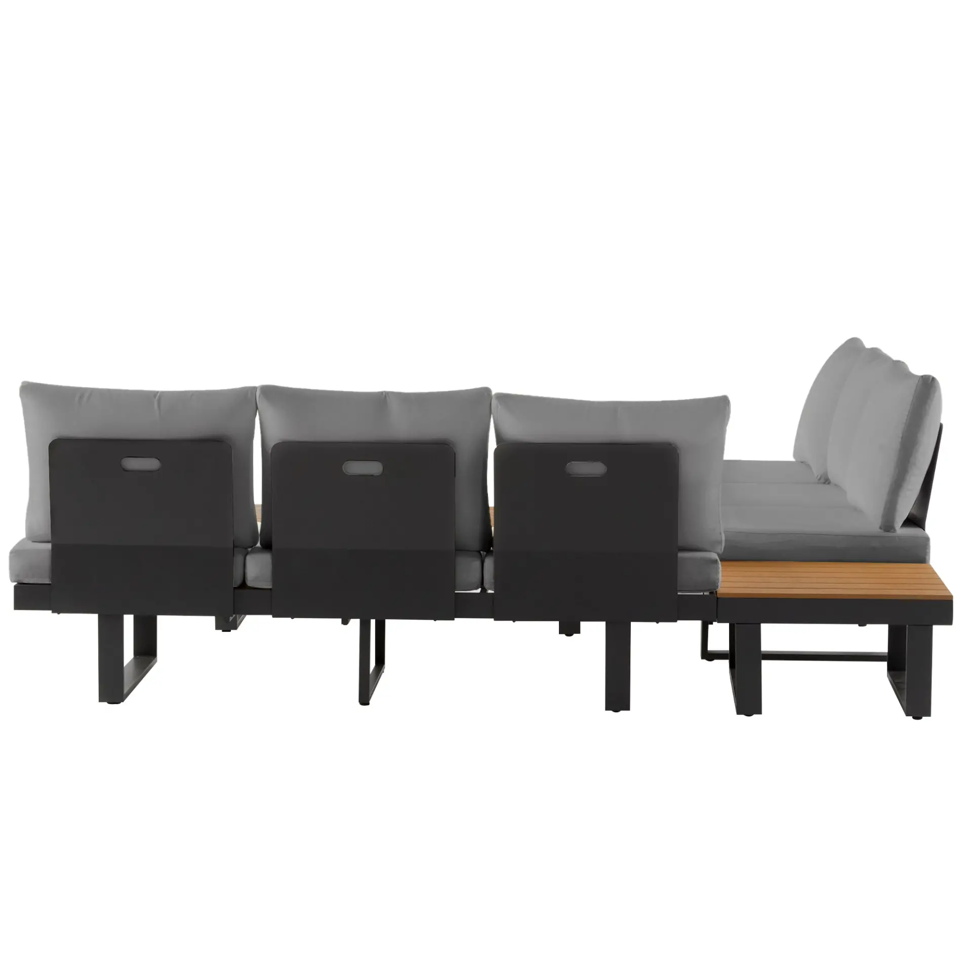 This versatile outdoor sofa set is designed for ultimate comfort and functionality, featuring adjustable seats with five reclining positions to suit any relaxation need. Its modular design allows for easy configuration between an L-shape or a straight-line layout, adapting seamlessly to different outdoor spaces. Built with a durable iron frame and weather-resistant WPC surfaces, this set ensures long-lasting performance against outdoor elements. The high-density sponge cushions wrapped in water-resistant fabric provide exceptional comfort and easy maintenance. Additionally, the set includes a spacious coffee table, a multifunctional small table, and hidden pull-out side tables, offering convenient storage and extra surface space for drinks, snacks, or decor. With a perfect balance of style, comfort, and practicality, this outdoor furniture set is an ideal choice for any patio, garden, or outdoor lounge area.