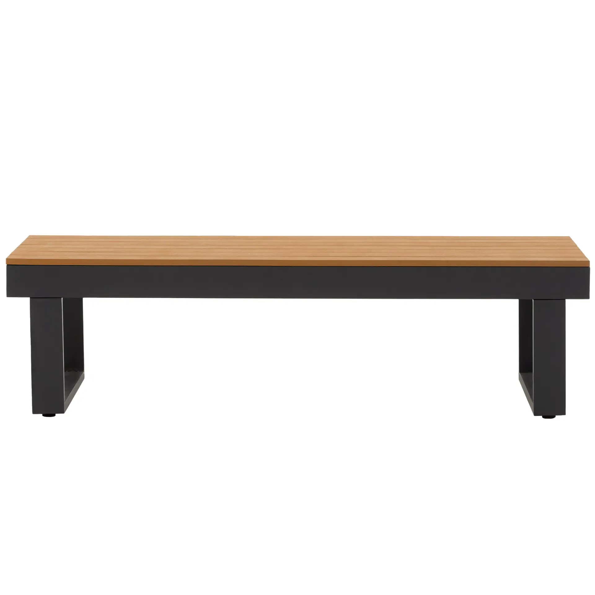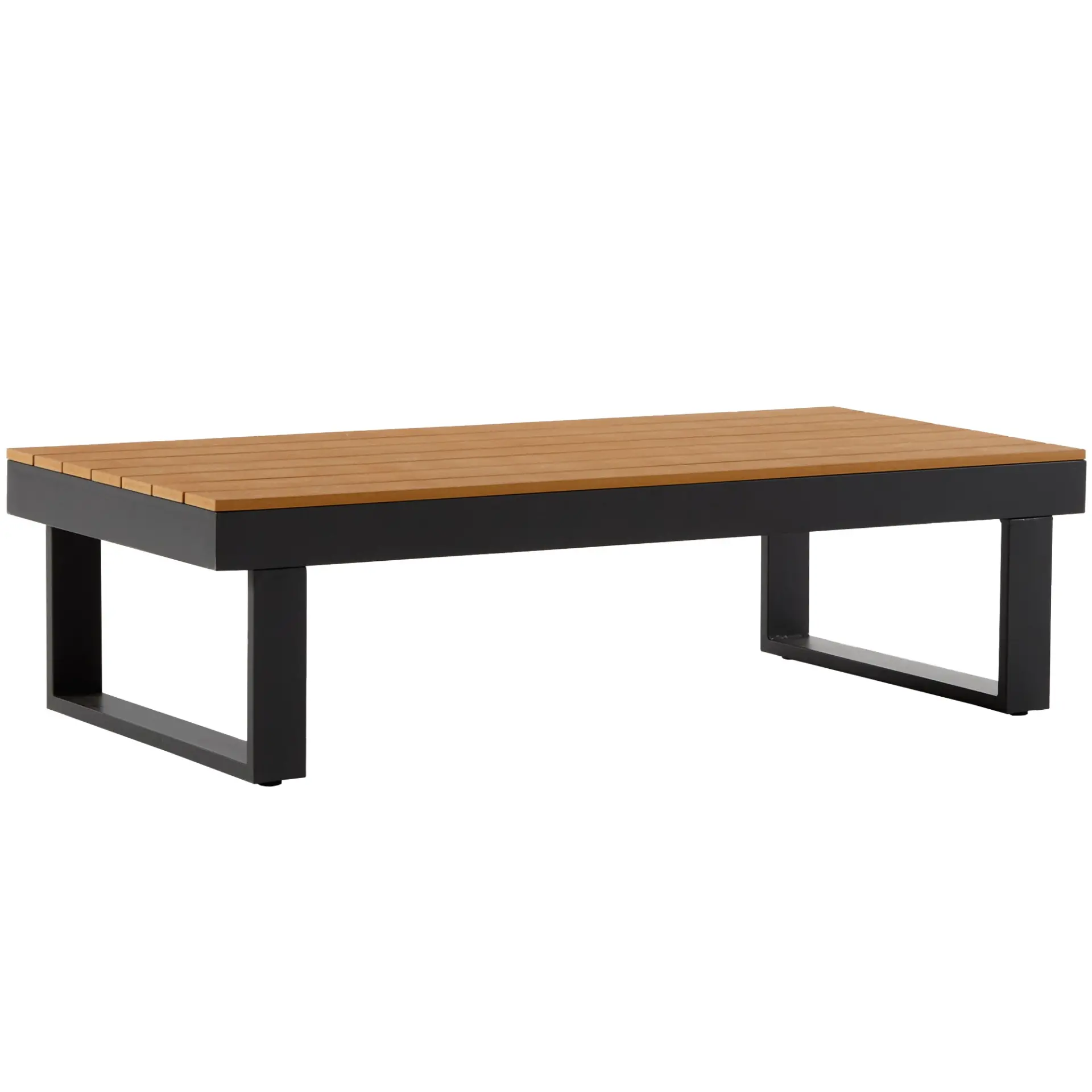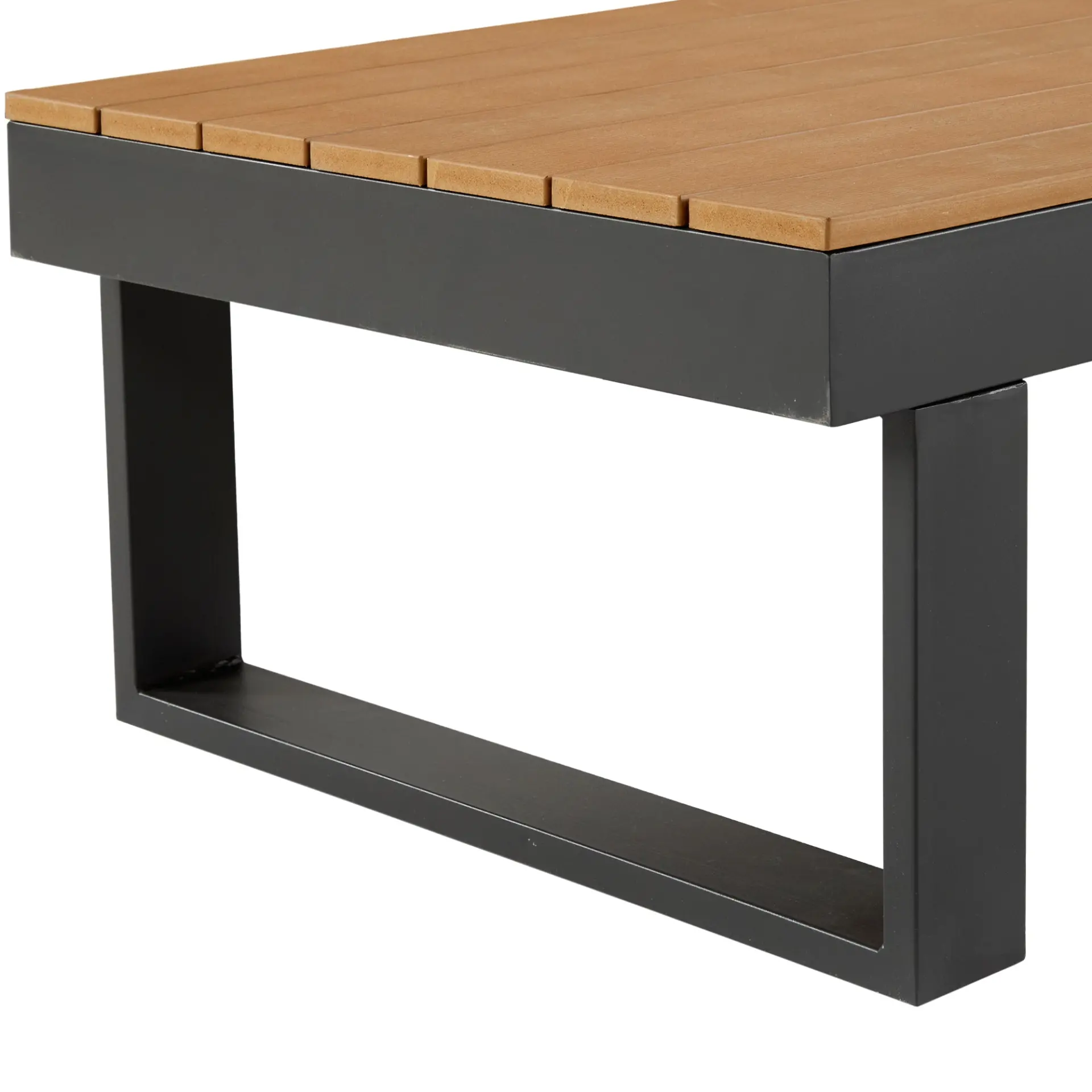 The set features a stylish coffee table with a WPC slatted surface that is water-resistant, providing a practical space for drinks and snacks.