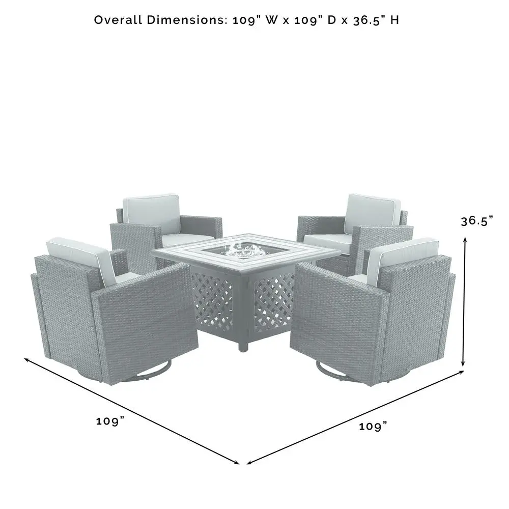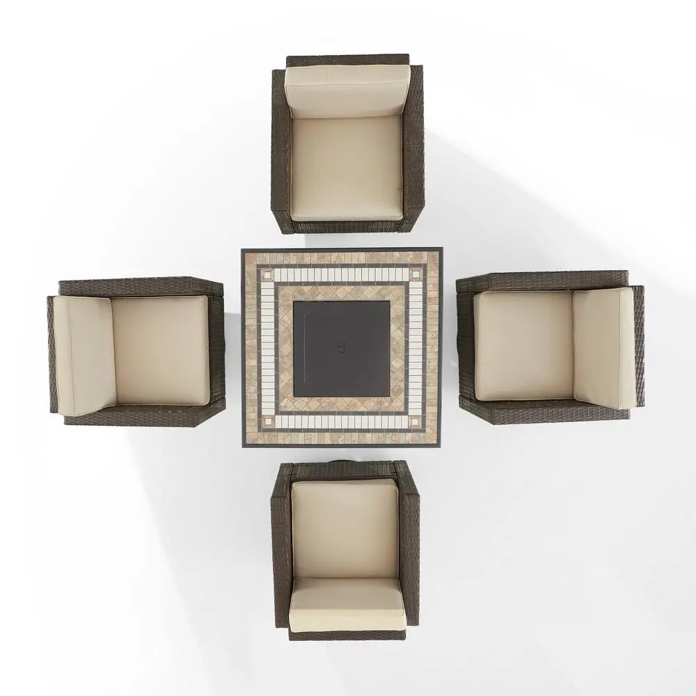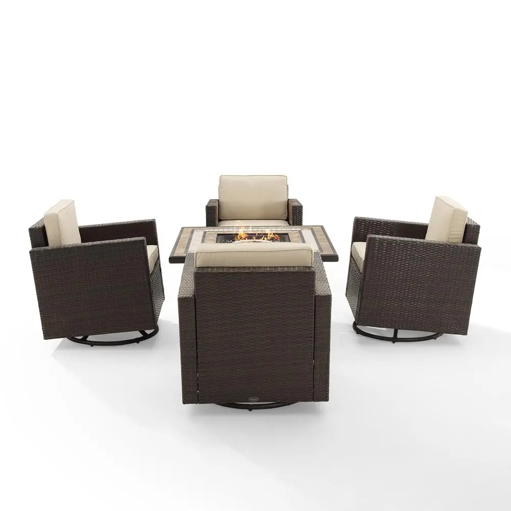 ALL-WEATHER PATIO FURNITURE: Ready to face the elements, this modern outdoor chair set features a weather-resistant, powder-coated steel frame wrapped in handwoven UV-resistant brown resin flat wicker. COMFORT WITH STYLE: The 5″ thick seat cushion and 4″ thick back cushion have moisture-resistant cushion cores. The sand covers with white piping are made from weather-resistant dyed yarn polyester. Each rocking chair boasts a 360-degree swivel base. The 50,000 BTU fire table has a tiled-stone top and uses a 20lb propane tank (not included). It includes a lid, 10 lbs of black glass fire beads, plus covers for the table and propane tank. AAA battery for the ignitor is not included. PERFECT FOR ENTERTAINING: This patio set seats up to four people and includes a fire table (41.88″W x 41.88″D x 25.13″H) and four swivel rocker chairs (26″H x 29.33″W x 28.25″D), creating a cozy and inviting outdoor space. AMERICAN LEGACY: Inspired by over 100 years of the Crosley legacy, Crosley Furniture offers style for every space, from retro to modern. Crosley products are proudly designed in the USA and come with USA-based customer support. UV resistant all-weather half-round resin wicker with rattan look Weather-resistant powder-coated steel frame Neutral sand outdoor cushion covers with white piping 360-degree swivel chair base High-performance solution-dyed polyester cushion covers resist sun fade and abrasion to keep your outdoor patio furniture looking good Moisture-resistant high grade cushion cores Removable cushion covers are machine washable Fire table has a tiled stone top