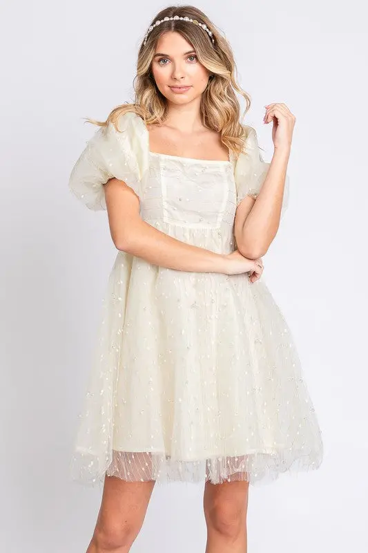 regular size, standard, young, contemporary, mesh, pearl, babydoll, dress, mini dress, short dress, square neck, puff sleeve, short sleeve, low back, elastic, back zipper, lining, lined, trendy, cute, stylish, fashionable, comfortable, daily wear, date wear, picnic wear, romantic, Easter, princess, spring, summer, ss, women’s clothing, women’s apparel, women’s wear