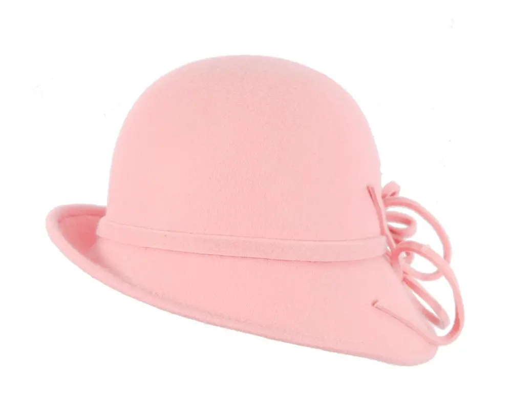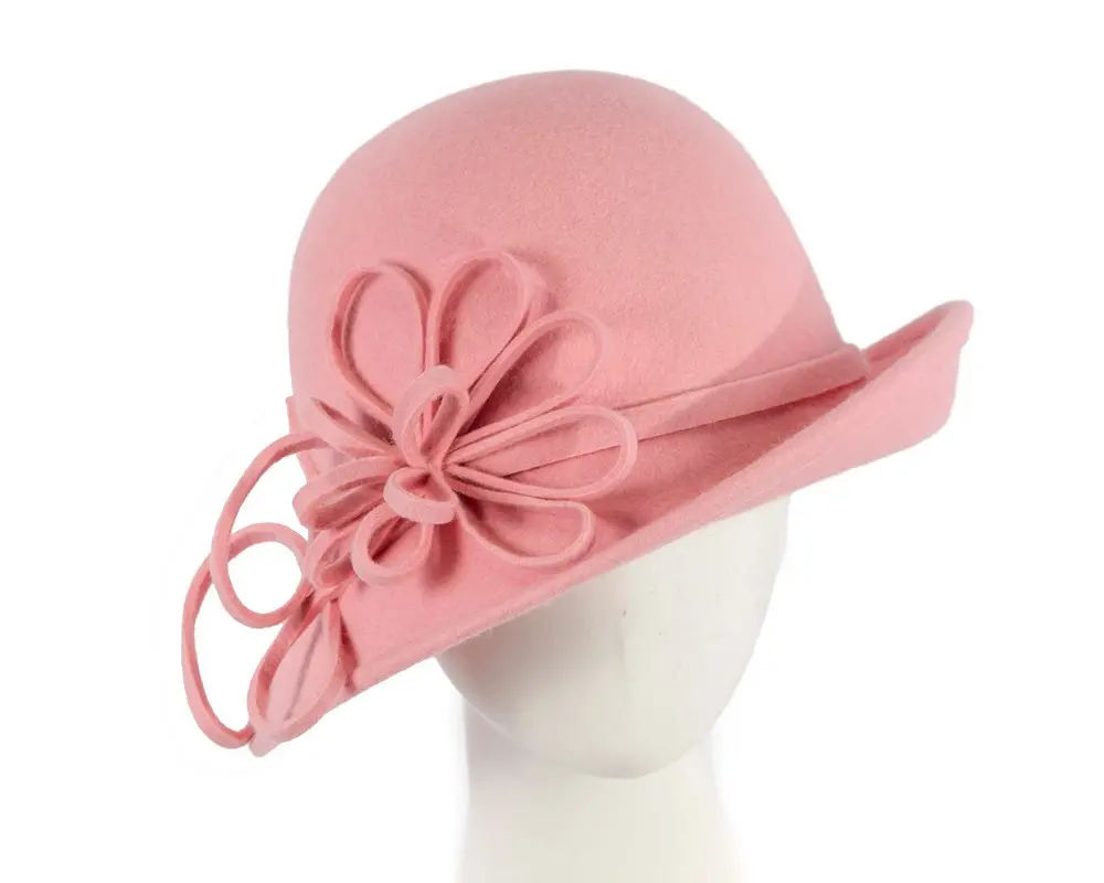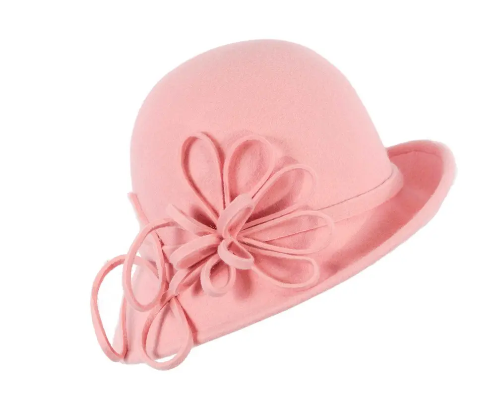 Classic pink felt cloche hat and hand-made felt loops and flower.